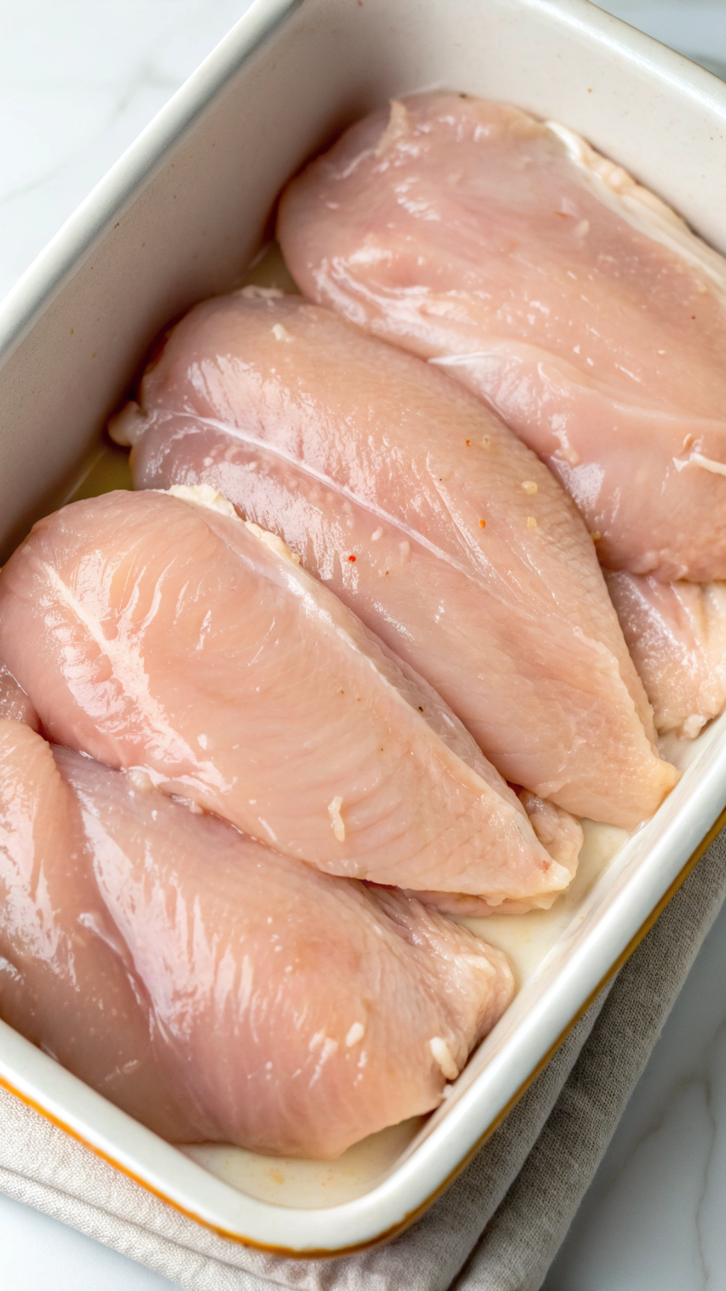 - Pat the chicken breasts dry with paper towels and place them in the prepared baking dish.