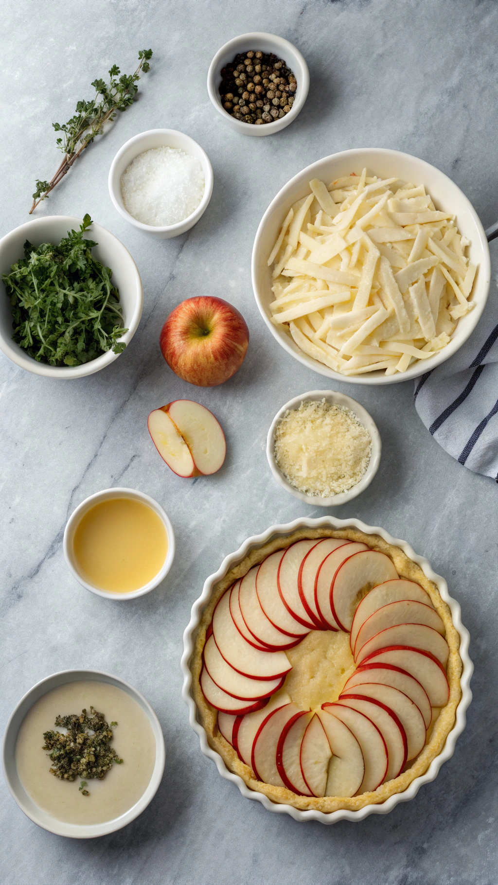 - Fan apple slices over the cheese in tight rows. Season lightly with salt and pepper, then sprinkle thyme leaves over the top.