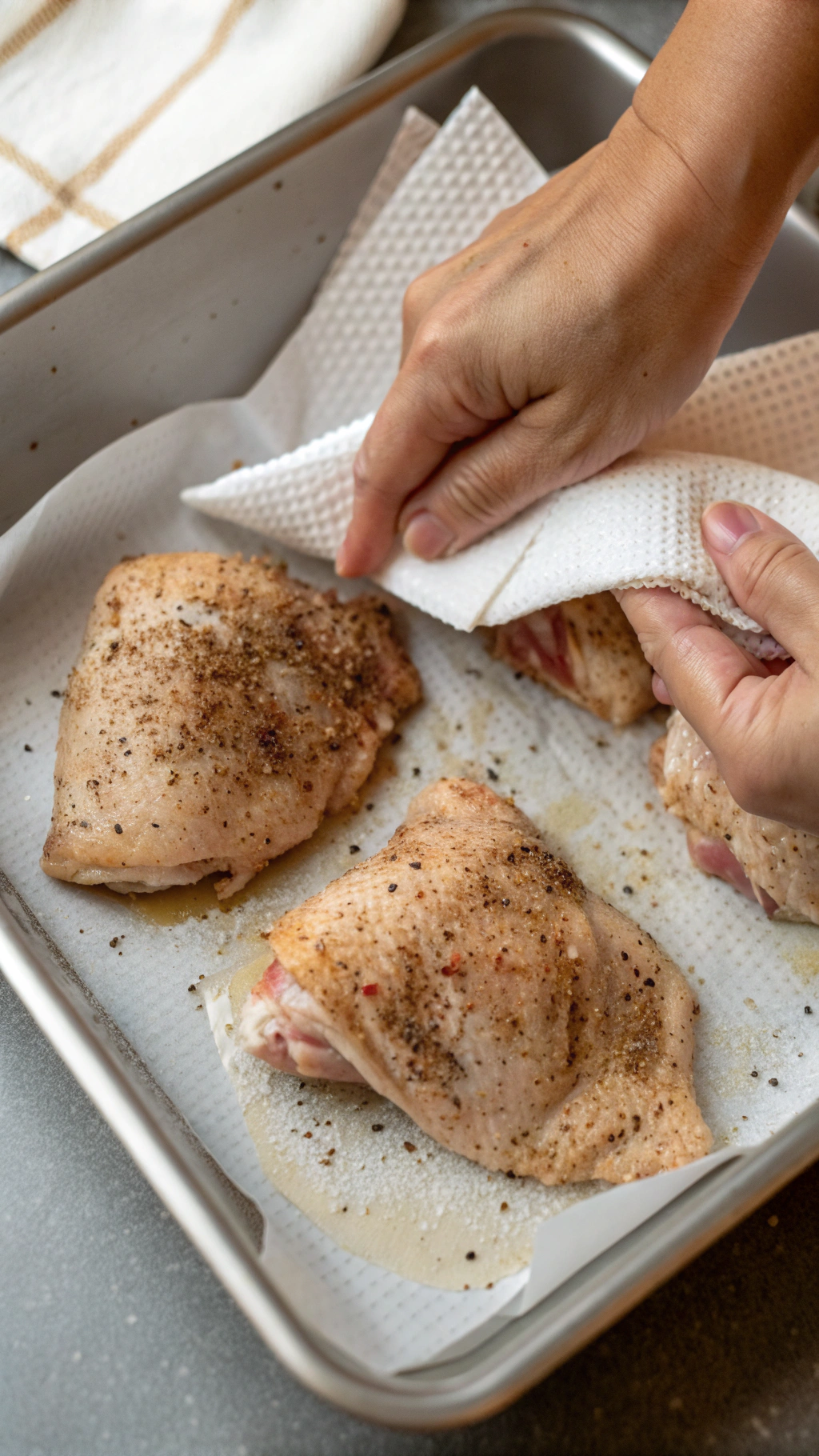 - Pat the chicken thighs dry with paper towels and arrange them in a single layer in the prepared baking dish, skin side up.