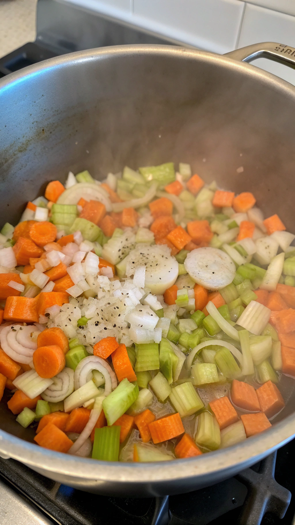 - Add the onion, celery, and carrots to the pot. Cook, stirring occasionally, until the vegetables begin to soften, about 5 minutes.