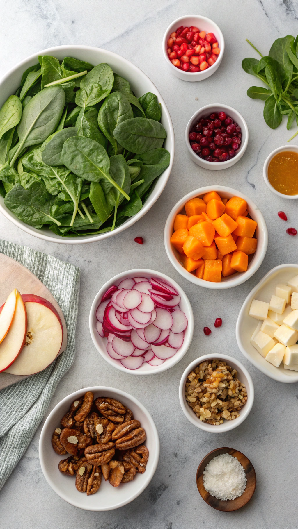 You use prewashed baby spinach, bagged squash cubes, and a jar-shake dressing, so the prep stays simple. A hot oven caramelizes small-dice squash in about 12 minutes, which gives you time to whisk the vinaigrette and slice an apple. The build happens right in the bowl, which means fewer dishes and faster clean up.