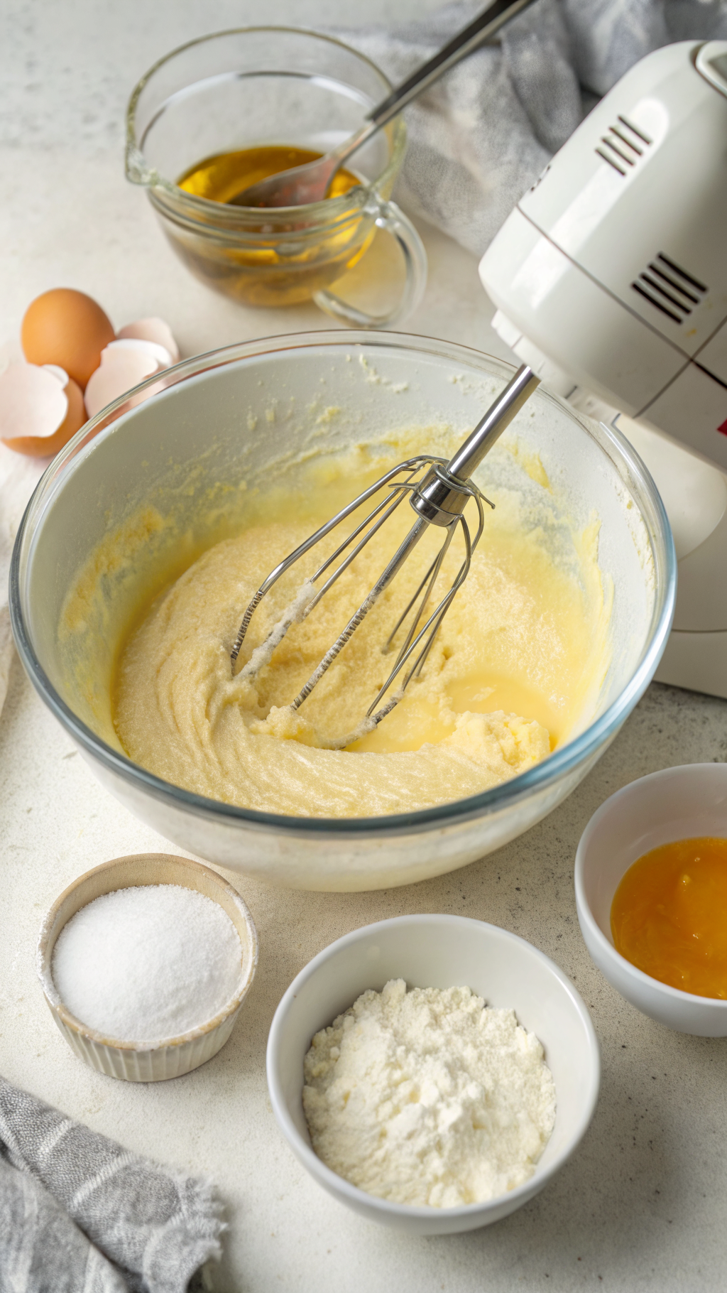 - Gradually add granulated sugar while beating on medium speed until well combined, then mix in vegetable oil and vanilla extract.
