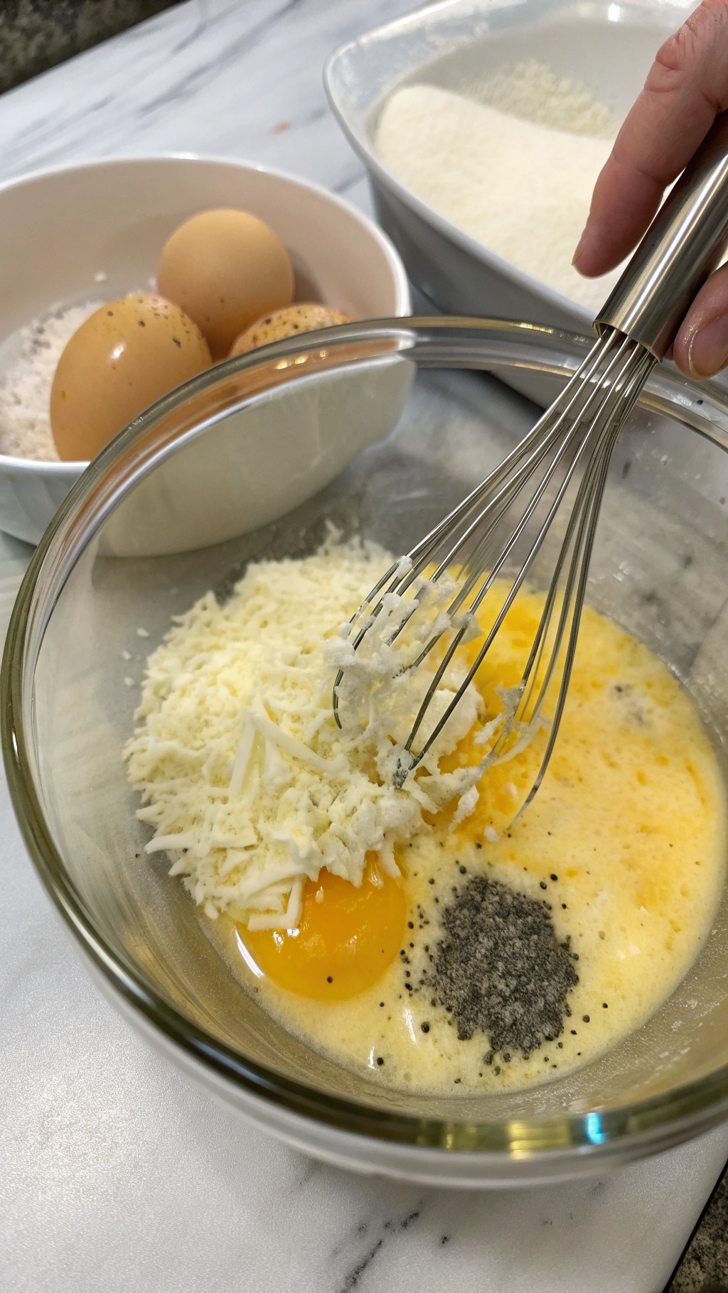 While the pasta cooks, add the eggs, extra yolk, Parmesan, and Pecorino to a mixing bowl. Whisk until the mixture looks thick, creamy, and smooth. Season with black pepper and a small pinch of salt. Set the bowl near the stove so you can reach it easily.