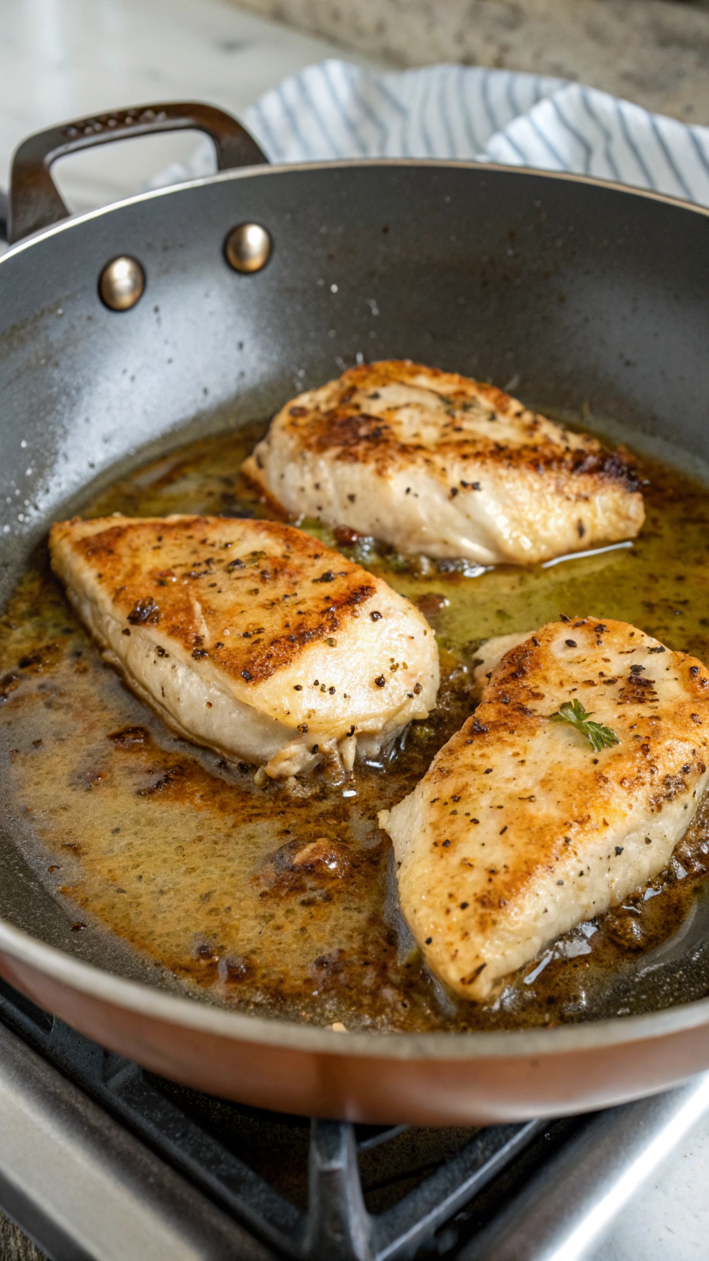 - Pour in the chicken broth, scraping up any browned bits from the bottom of the pan. Simmer for 2–3 minutes to reduce slightly.