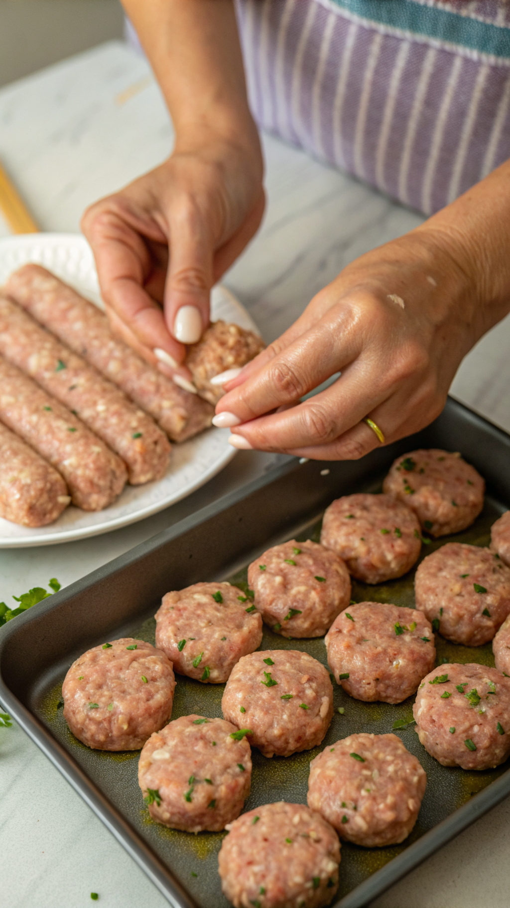 Shape each portion into a small oval or log shape, or form round meatballs if that feels easier. Line the shaped kofta on a plate or small tray. Keep them in the fridge while you heat the pan so they stay firm.