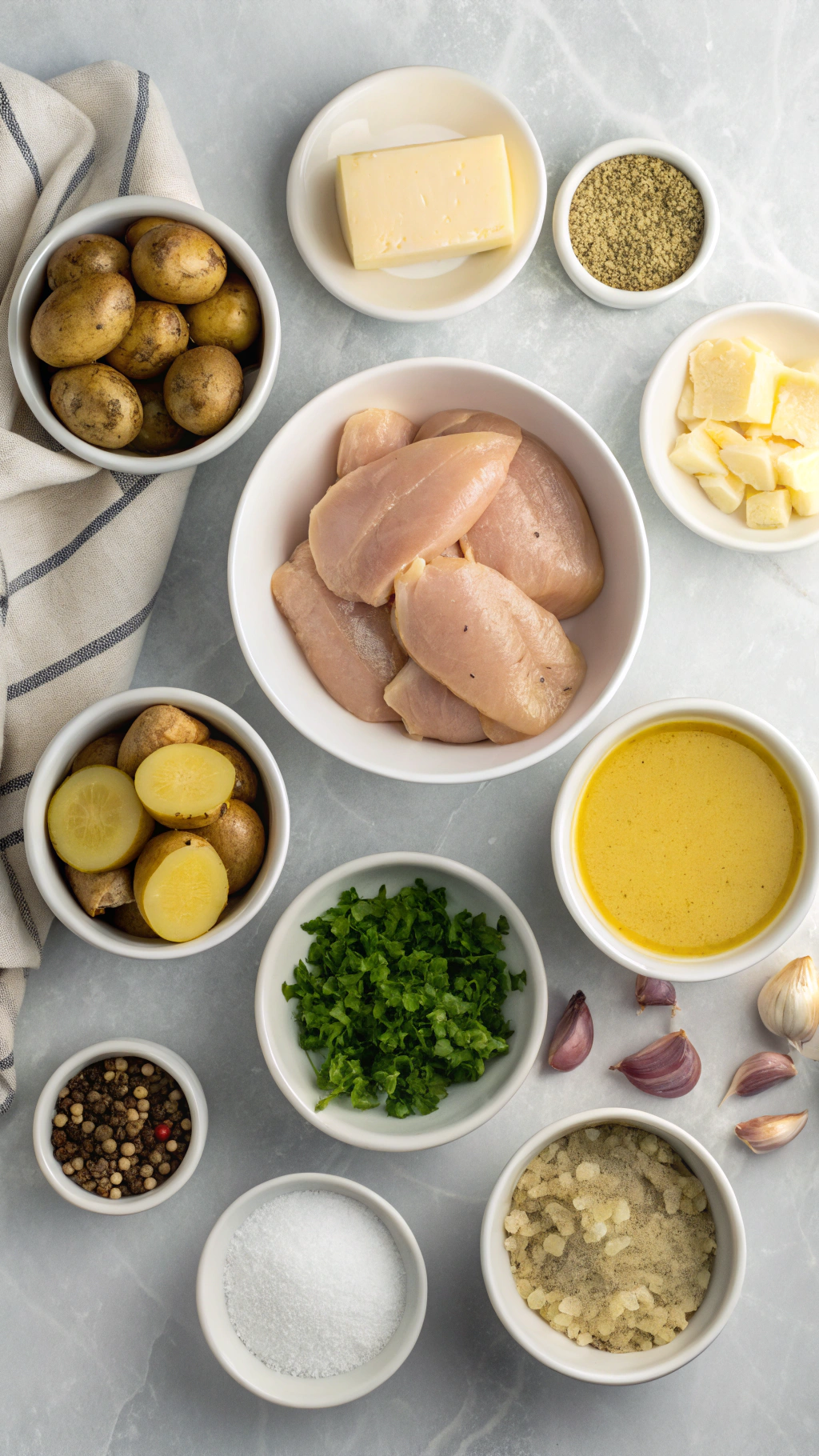 - Bake for 25–30 minutes, or until the potatoes are tender and the chicken reaches an internal temperature of 165°F (74°C).