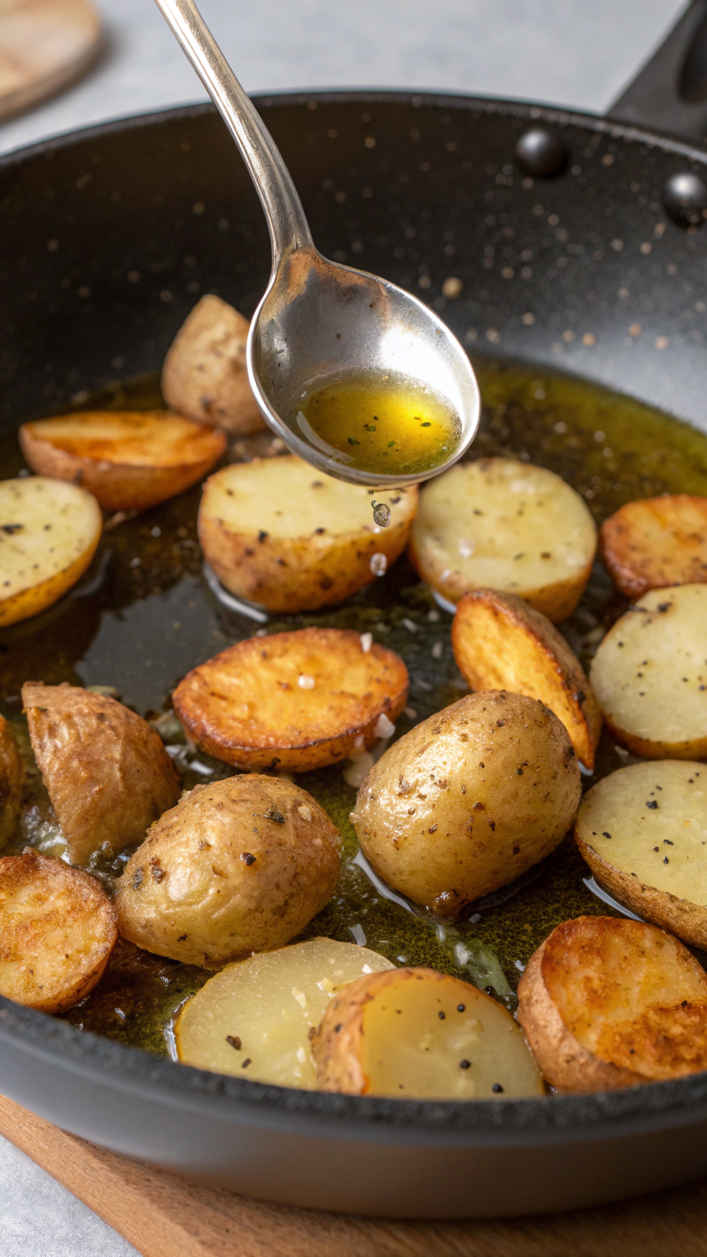 Add the remaining 1 tablespoon olive oil to the same skillet. Add the halved baby potatoes cut side down and cook 4 to 5 minutes until the cut sides turn golden. Stir, then add the sliced onion and a pinch of salt and cook 4 to 5 more minutes until the onion softens and turns lightly browned.