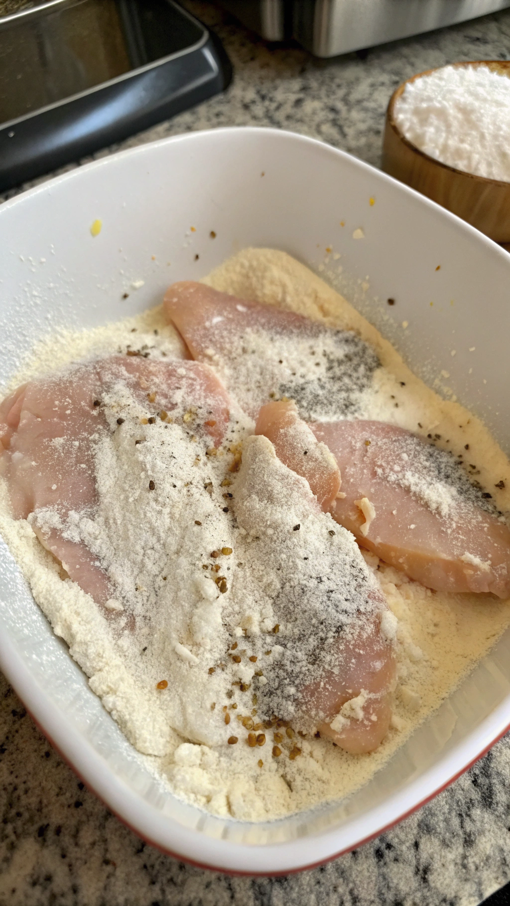 - In a shallow dish, combine the flour, salt, black pepper, and garlic powder. Dredge each chicken cutlet in the seasoned flour, shaking off any excess.