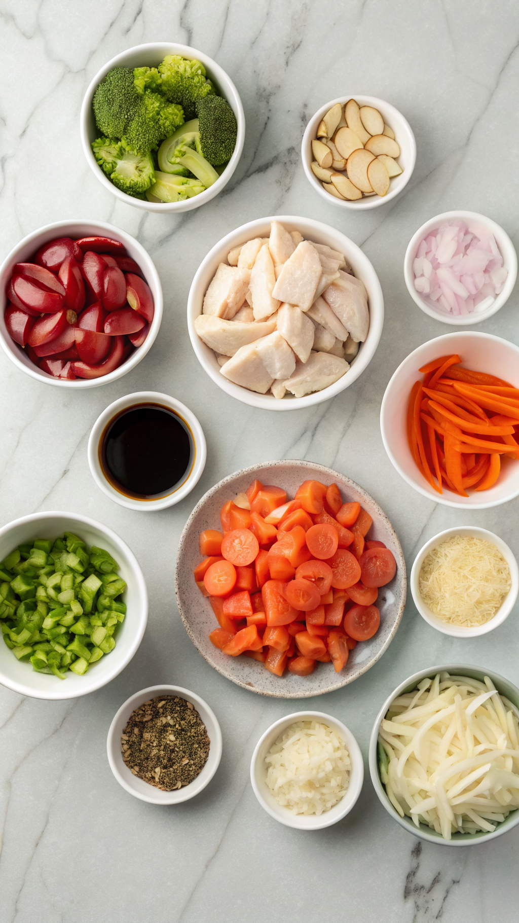 - In a medium bowl, combine the sliced chicken with 2 tablespoons soy sauce and 1 tablespoon cornstarch. Toss to coat evenly and let marinate for 10 minutes while you prepare the vegetables and sauce.