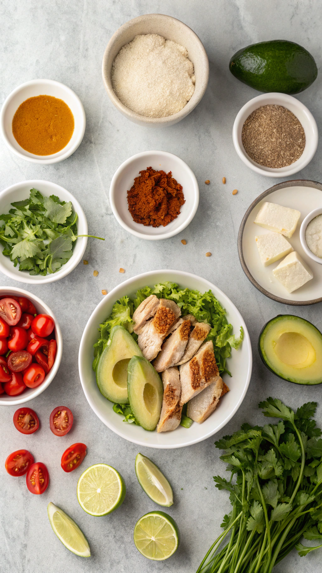 - Top with diced avocado, cherry tomatoes, cucumber slices, red onion, and chopped cilantro.