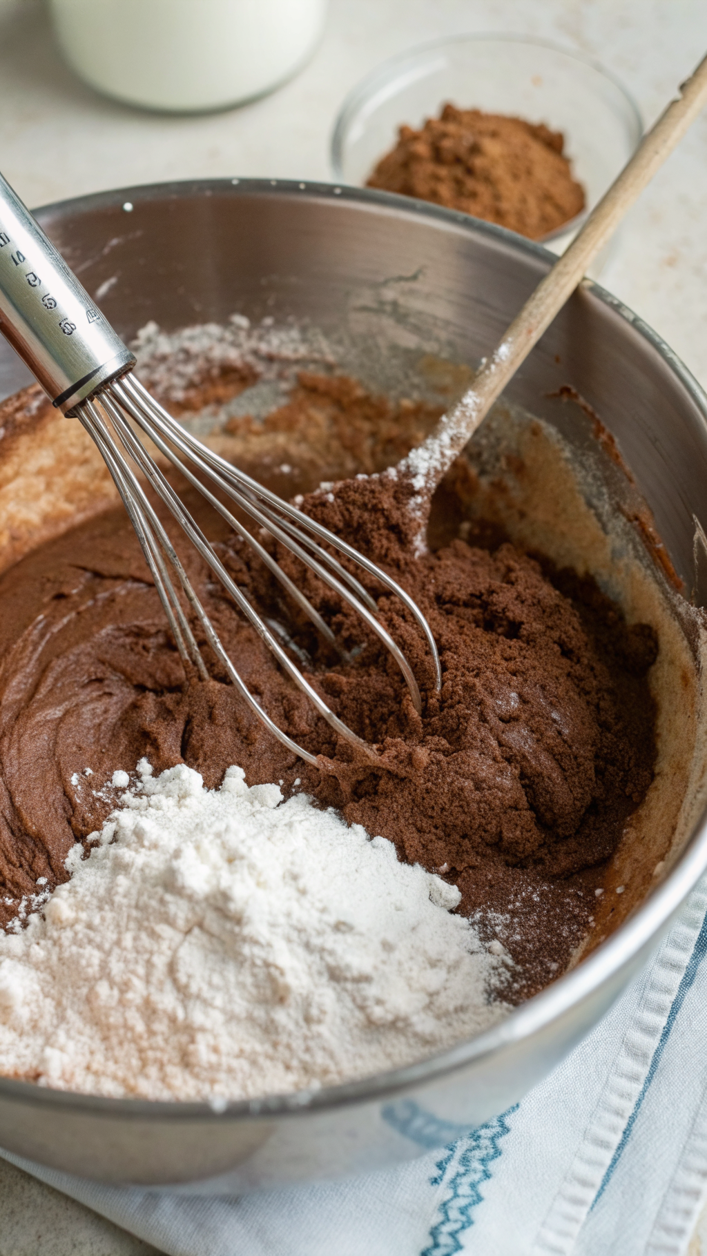 - In a mixing bowl, whisk together the flour, sugar, cocoa powder, baking powder, baking soda, and salt until well combined.