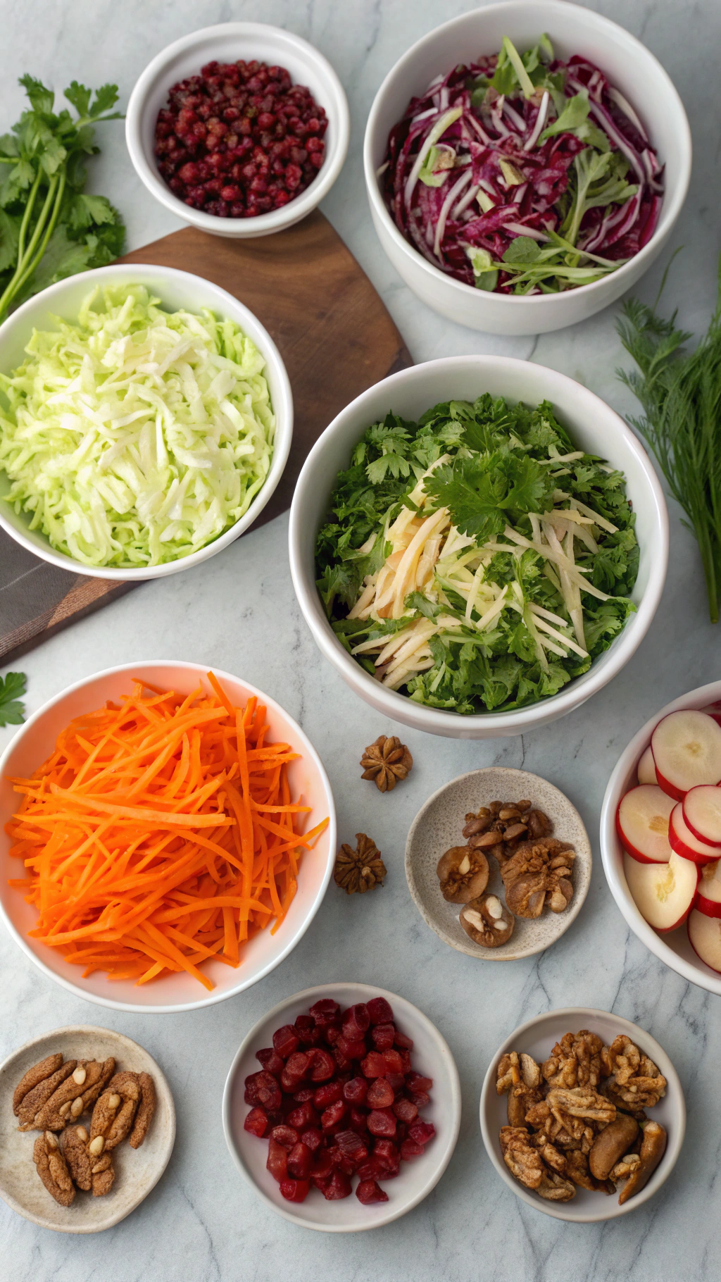 - Build the slaw base. In a large bowl, combine green cabbage, red cabbage, carrots, apple, scallions, parsley, and dried cranberries.