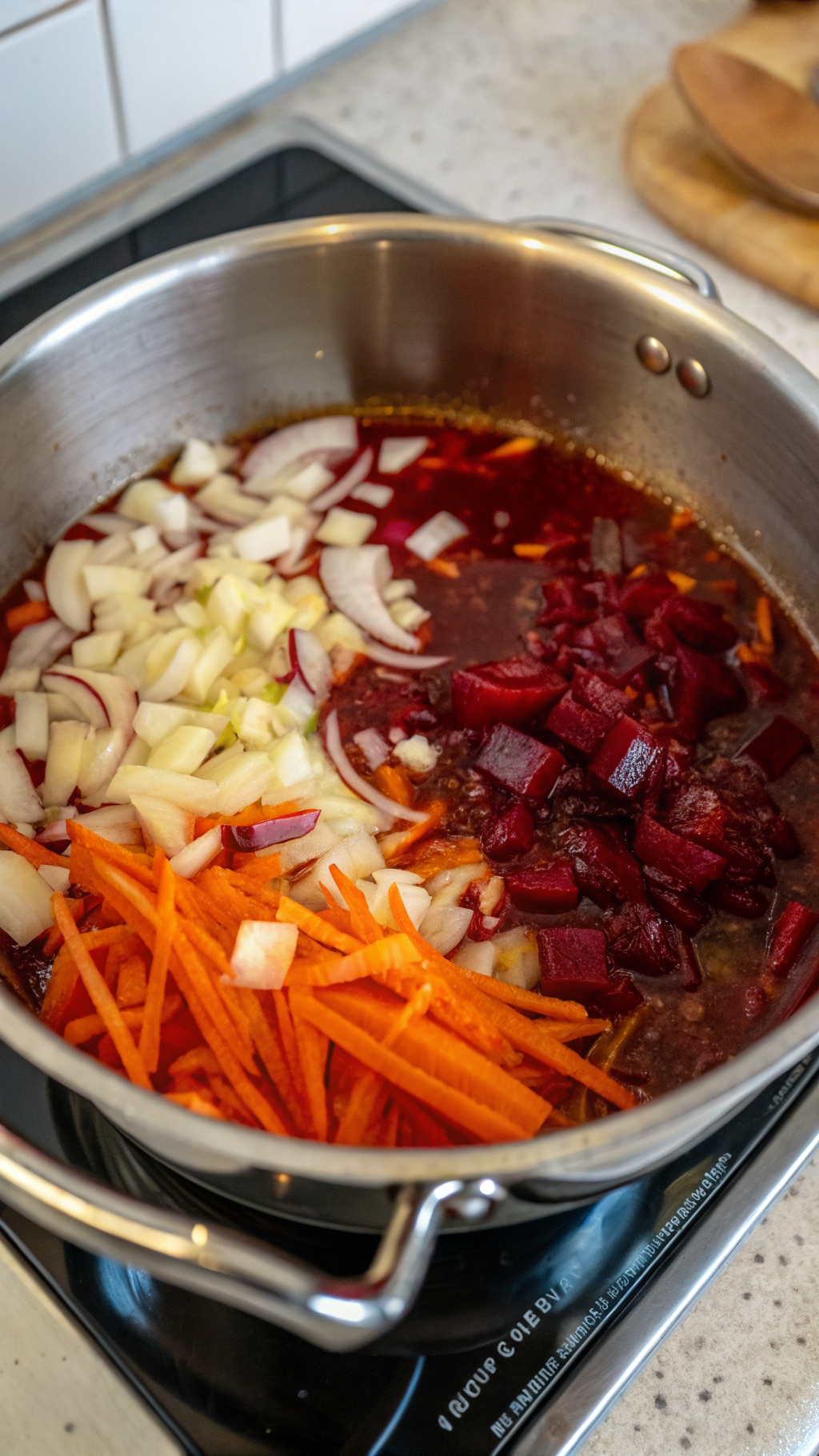 Once the broth boils, lower the heat to maintain a steady simmer. Add the cubed potatoes and grated beets to the pot and stir. Simmer for about 20 minutes, until the potatoes start to soften and the broth turns a deep ruby color.