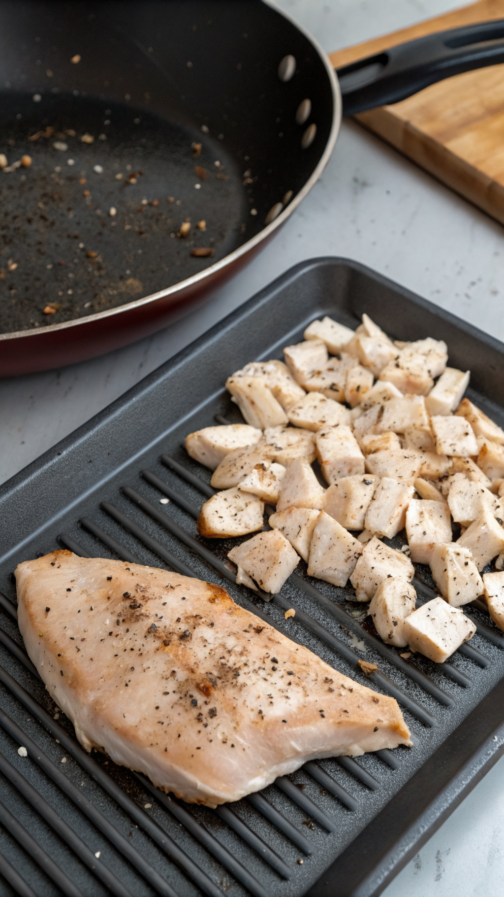 Season the chicken breast on both sides with salt and pepper. Heat a drizzle of olive oil in the same skillet over medium heat and add the chicken. Cook about 5 to 7 minutes per side, until the outside browns and the center cooks through, then let it rest for 5 minutes before slicing or dicing.