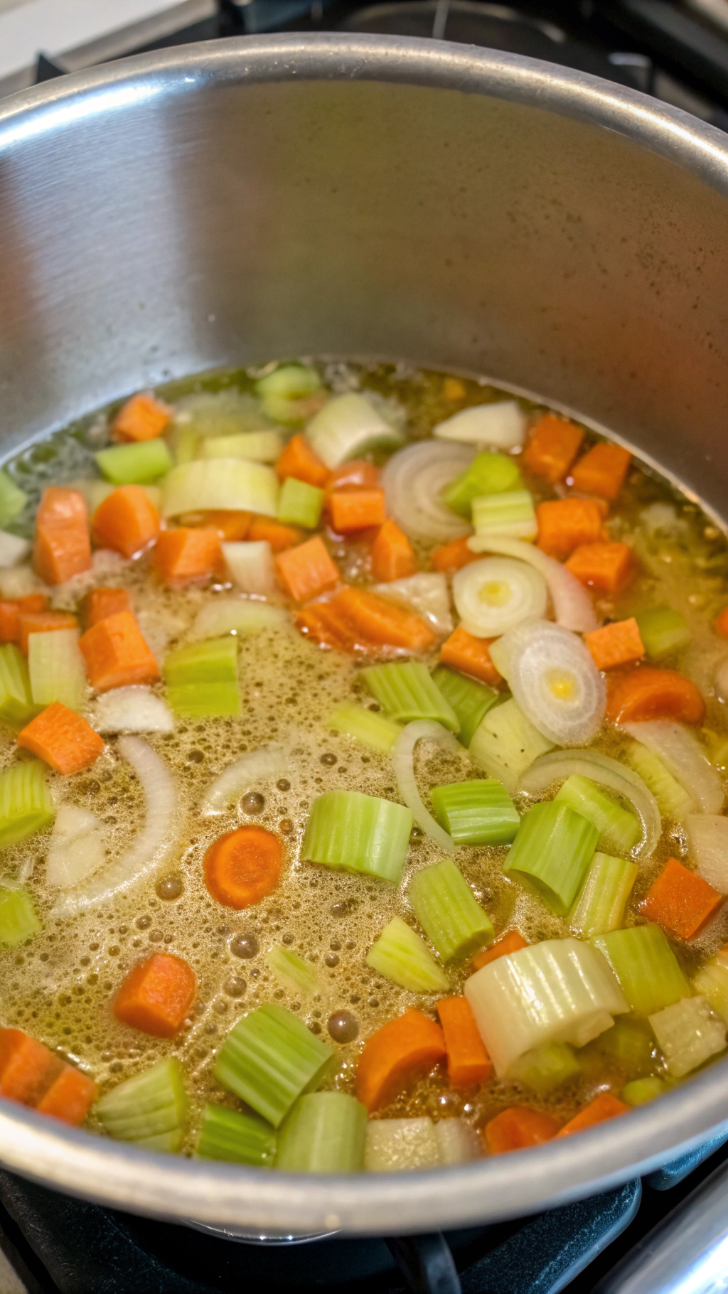 Pour in seafood stock and chicken stock if you use it, then add the bay leaf. Bring the mixture to a gentle boil, then lower the heat to a steady simmer. Cook 15 to 20 minutes so the flavors meld and the vegetables soften fully. Taste and adjust salt and pepper so the base already tastes delicious before you blend.