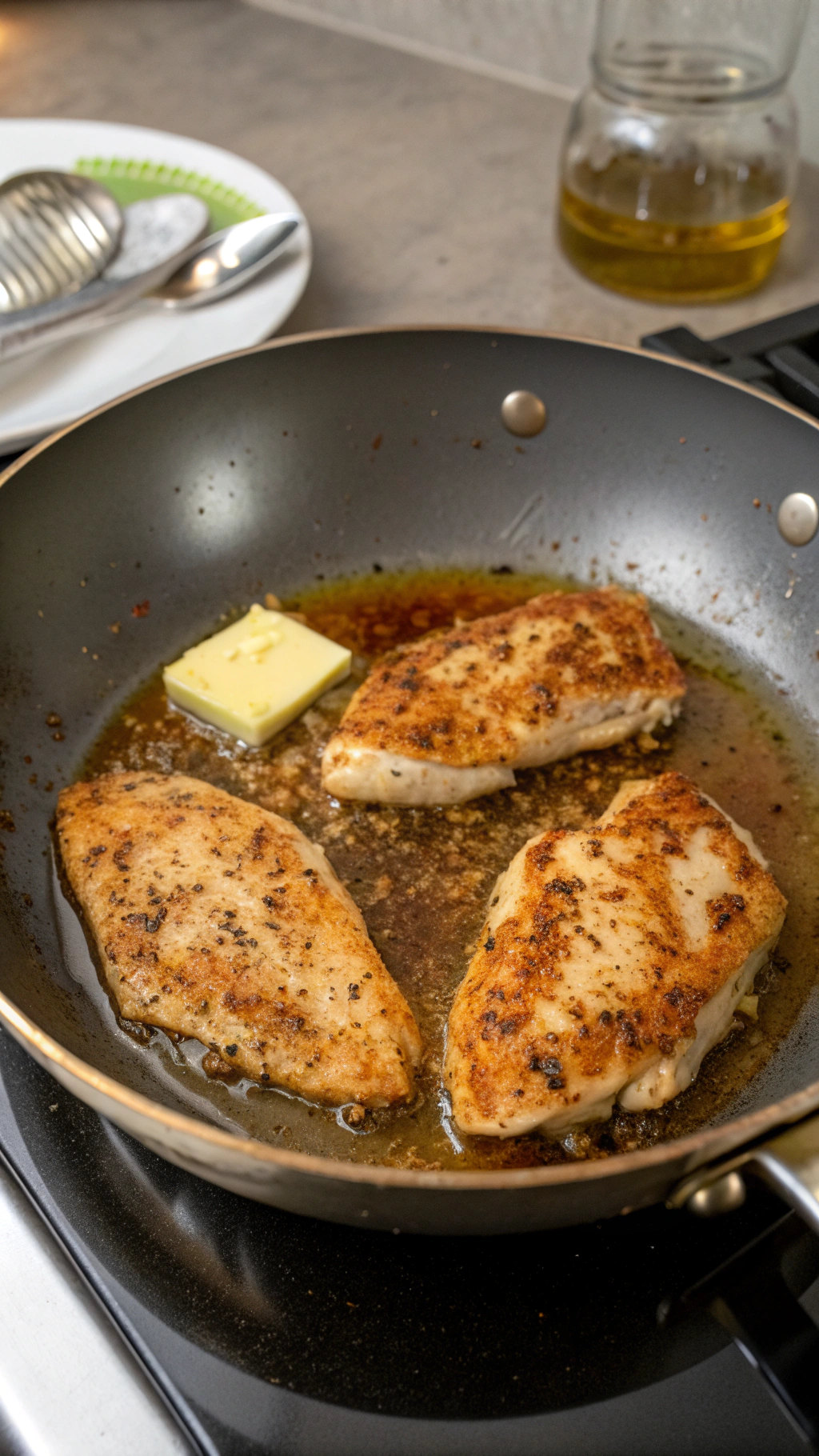 2. Heat the olive oil and 1 tablespoon of butter in a large skillet over medium-high heat. Add the seasoned chicken breasts and cook for 5–6 minutes per side, or until golden brown and cooked through. Remove the chicken from the skillet and set aside on a plate.