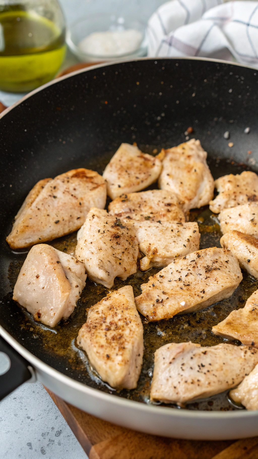 - Add the chicken pieces, season with salt and black pepper, and cook for 6–8 minutes, stirring occasionally, until browned and cooked through. Transfer the chicken to a plate and set aside.