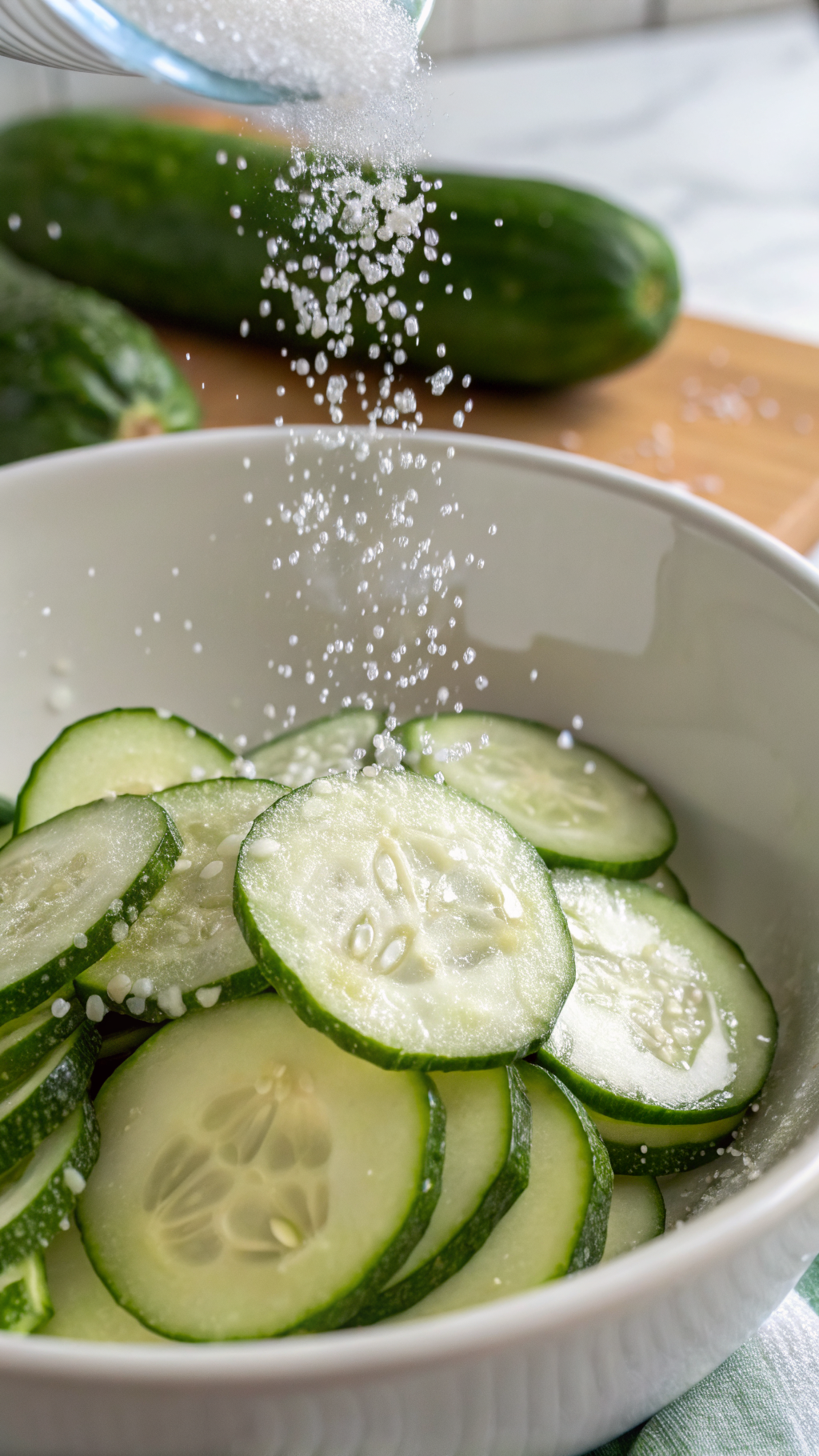 Wash the cucumbers and pat them dry. Slice them into thin rounds, about ⅛ inch thick, with a sharp knife or mandoline. Place the slices in a colander set over the sink, sprinkle with ½ teaspoon kosher salt, and toss to coat.