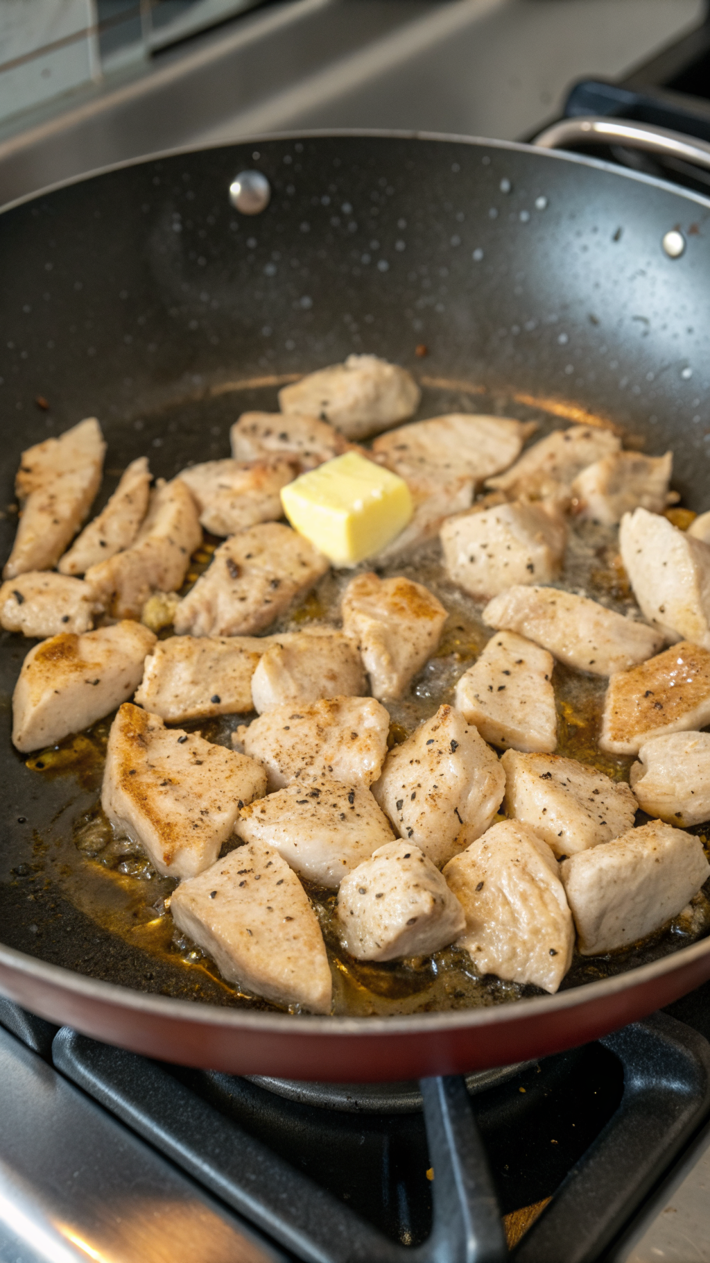 Cook the chicken for 3 to 4 minutes per side until the pieces turn golden and cooked through. Stir occasionally but give the pieces time to brown. Transfer the cooked chicken to a plate and keep it nearby.