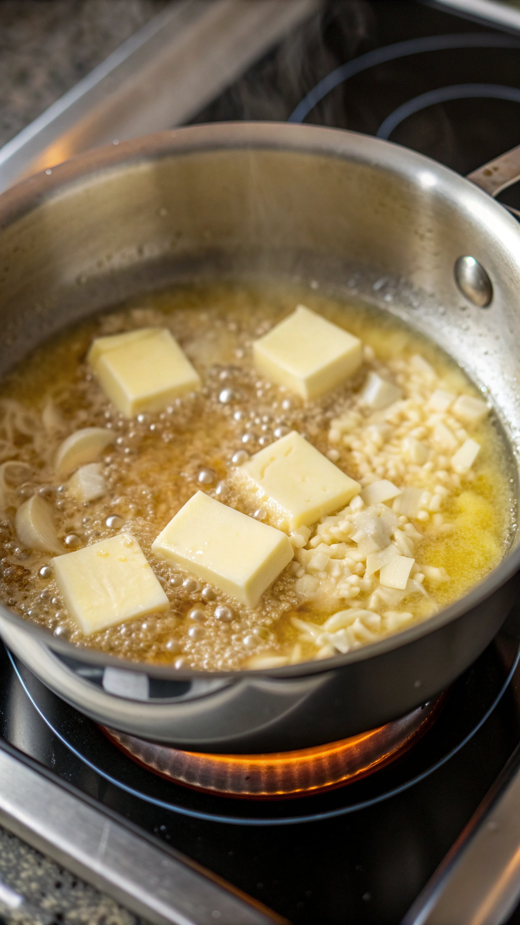 - In a separate small pan, melt the butter over medium-low heat. Add the minced garlic and cook for 1–2 minutes until fragrant but not browned, then stir the garlic-butter mixture into the creamy broth.