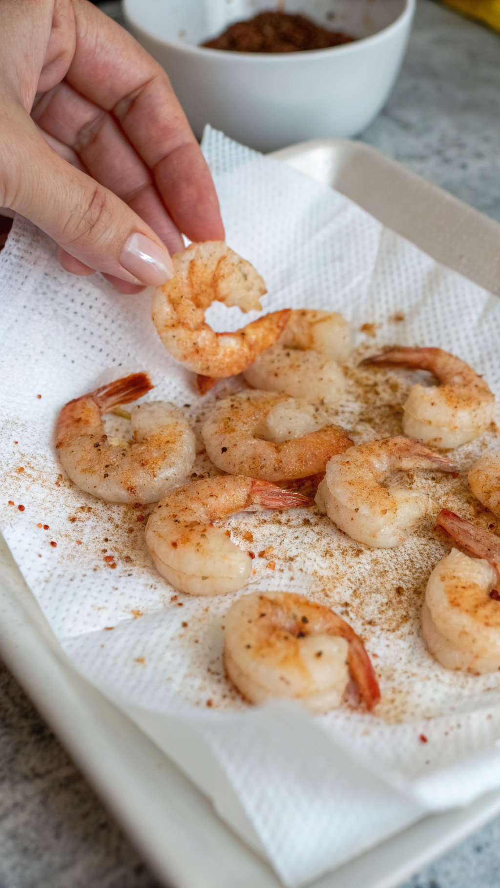 - Pat shrimp very dry so they sear and do not steam.