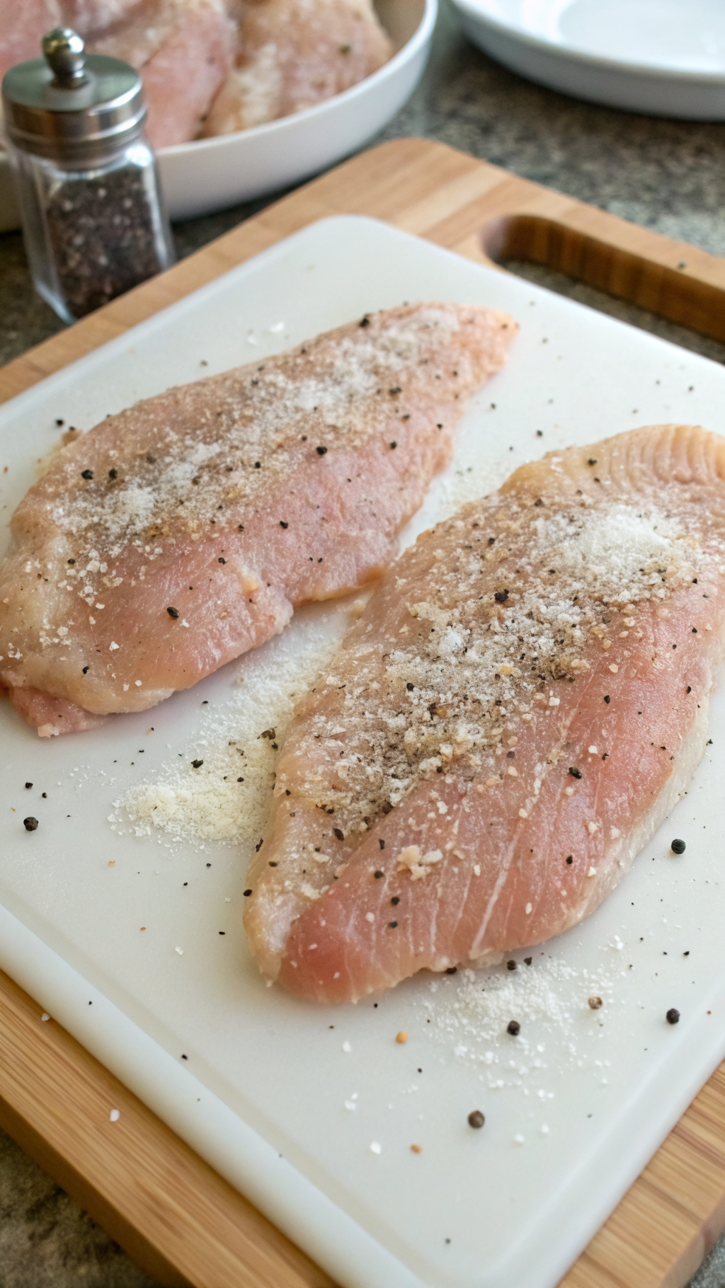 Place the chicken breasts on a cutting board and slice them in half horizontally to make 4 thin cutlets. If some pieces look thicker, cover them with plastic wrap and gently pound with a meat mallet or rolling pin until they look even. Season both sides with salt, pepper, garlic powder, and onion powder.