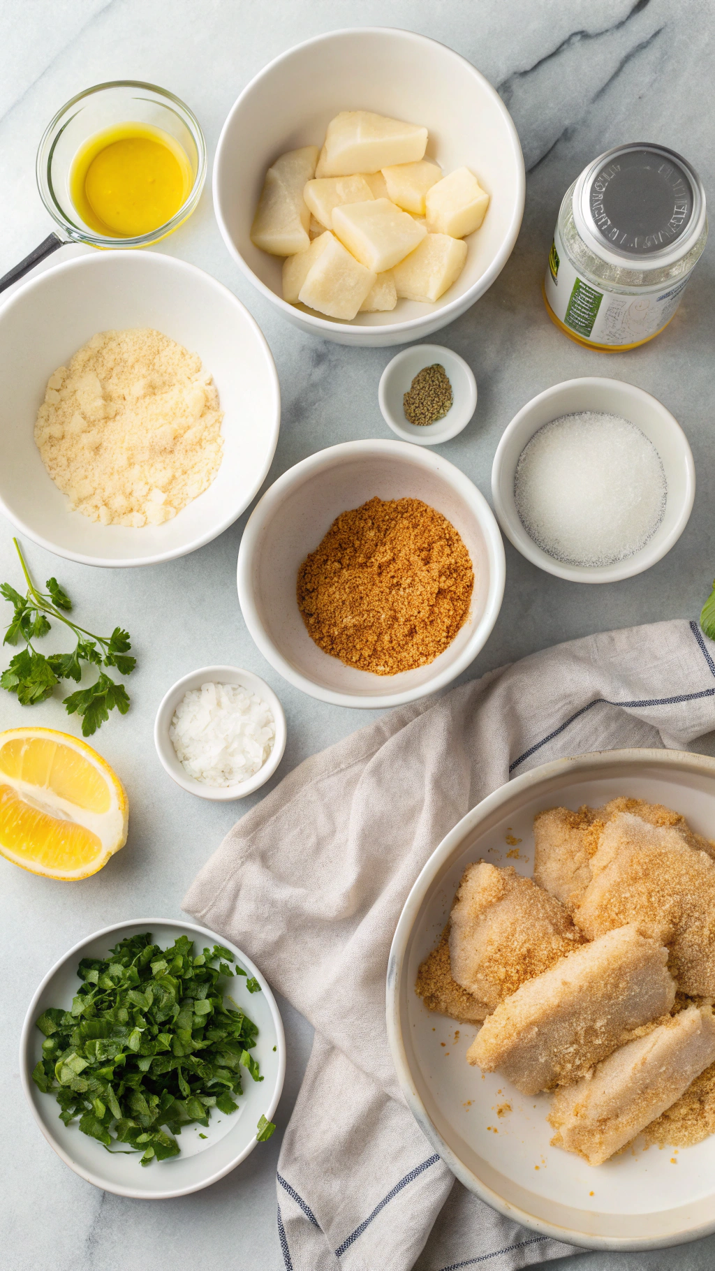Preheat the oven to 425°F so the fish bakes hot and crisp. Line a rimmed baking sheet with parchment paper or place a lightly oiled baking rack on top of the sheet. This setup keeps the bottom from steaming and helps the crust stay crunchy.