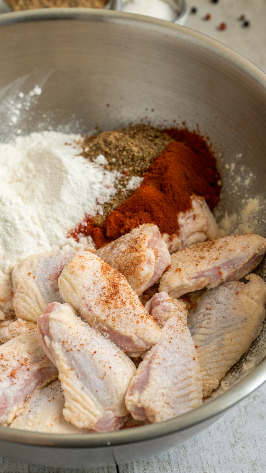 - Toss wings evenly in baking powder mixture so every piece gets a thin, light coating, not clumps.