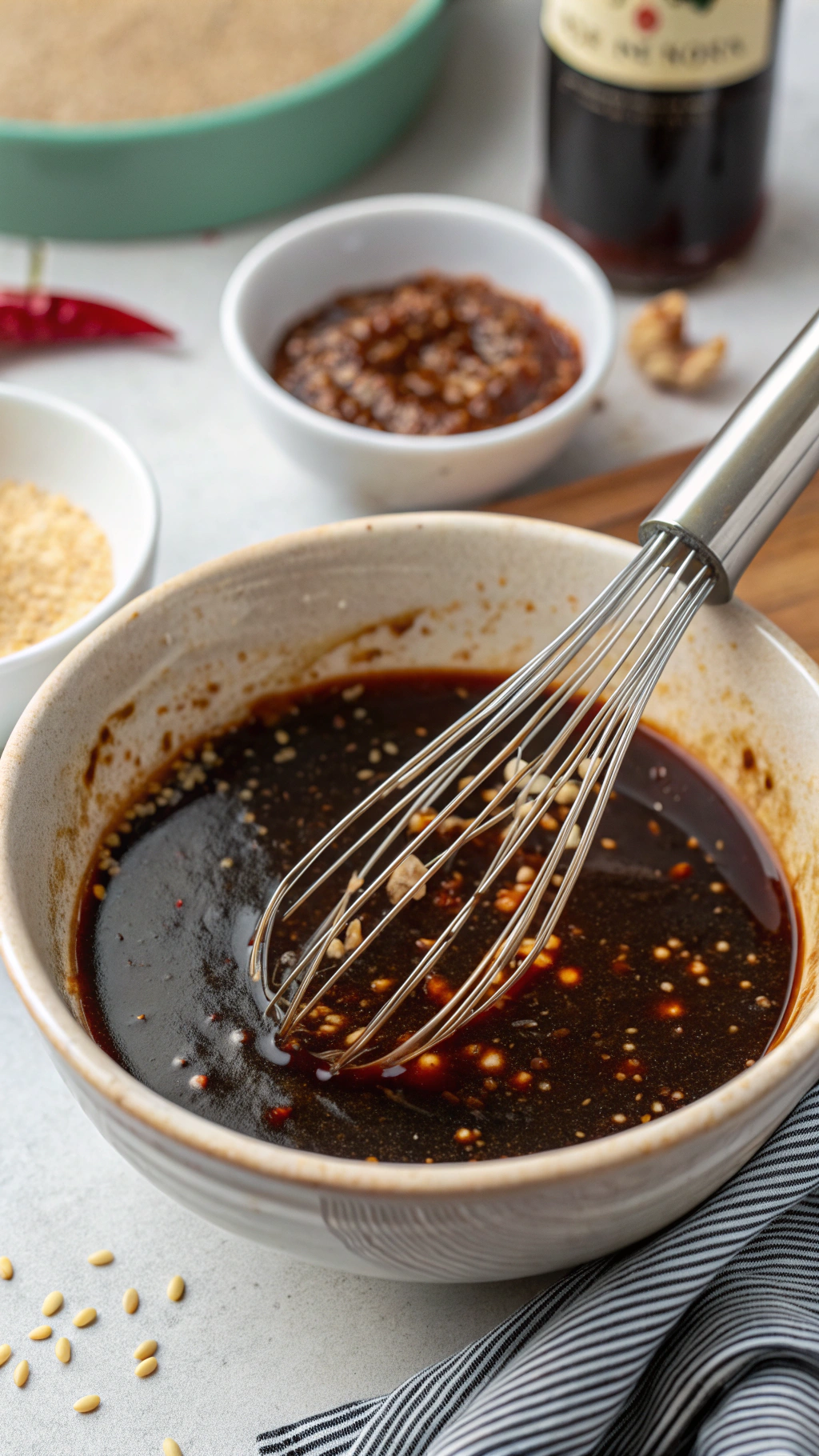 - In a small bowl, whisk together hoisin sauce, soy sauce, rice vinegar, honey, minced garlic, grated ginger, and sesame oil until smooth.
