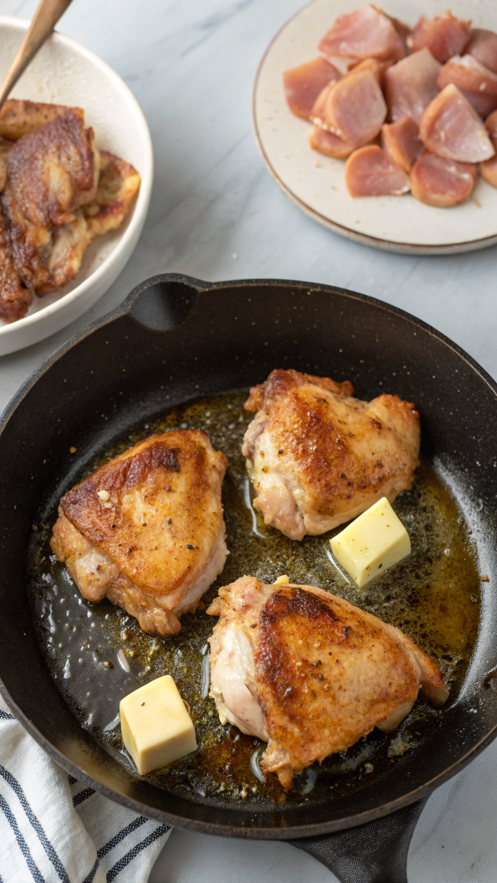 - Brown the chicken thighs in a skillet for 3 to 4 minutes per side if you want extra flavor and a bit of texture.