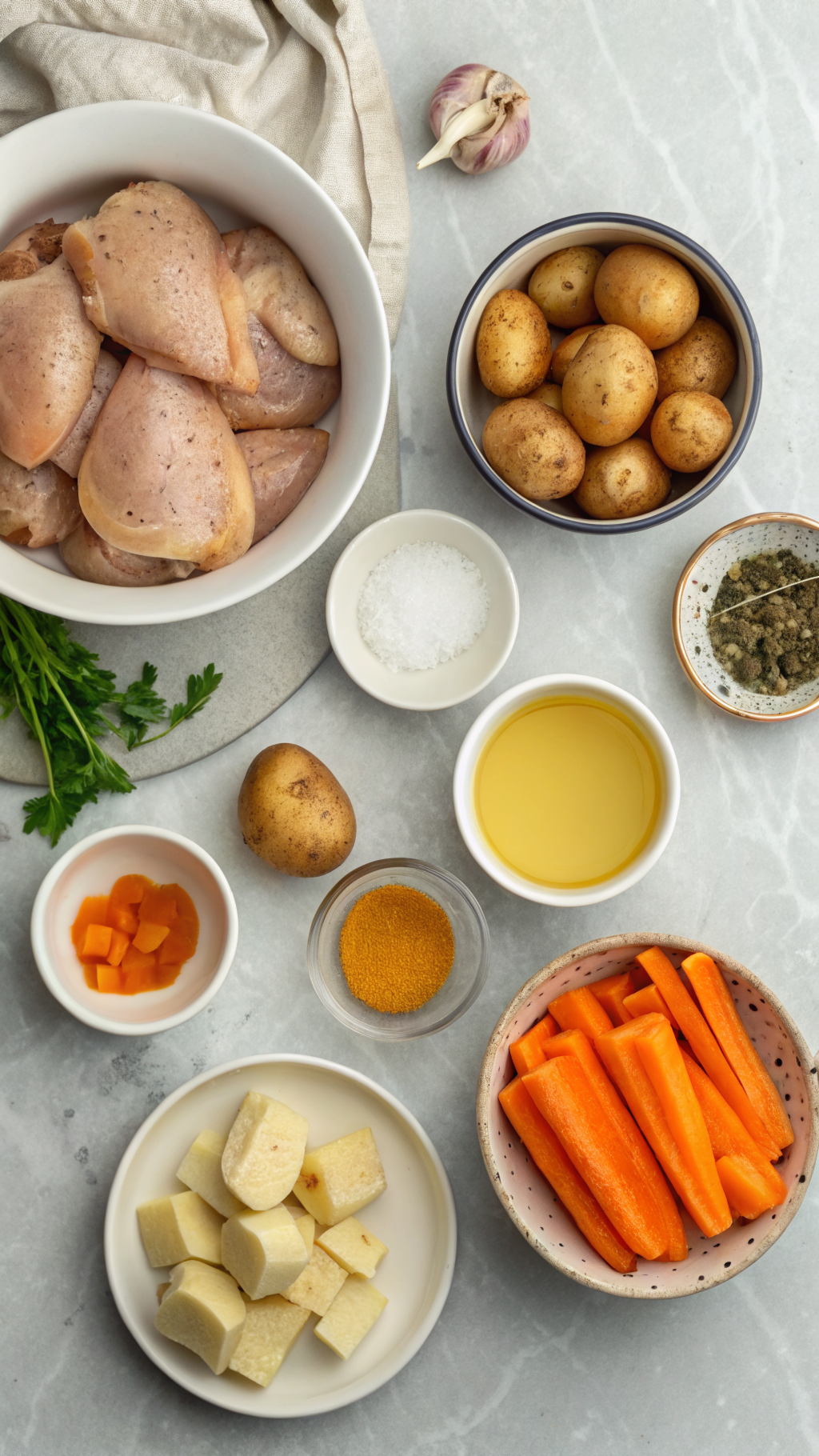 Scrub the baby potatoes and cut them in half, or in quarters if they look large. Peel the carrots and cut them into thick chunks so they hold shape. Slice or chop the onion. Pat the chicken dry with paper towels and trim any extra fat or skin that hangs off.
