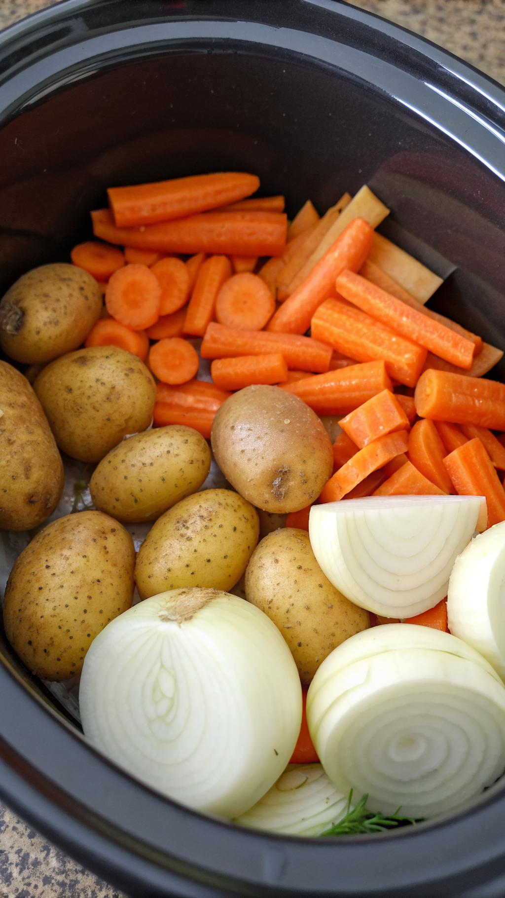 • Place potatoes and carrots on the bottom of the Crock Pot and set chicken on top so the chicken juices baste the veggies.