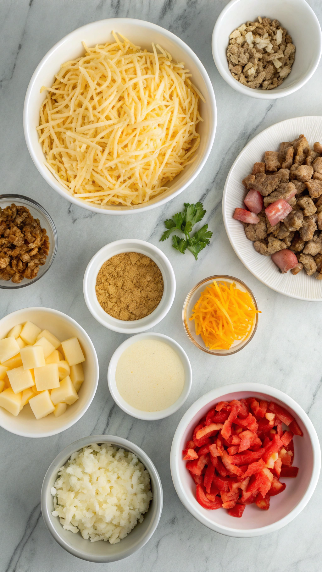 - Ham and Swiss: swap sausage for diced ham and use Swiss plus cheddar.