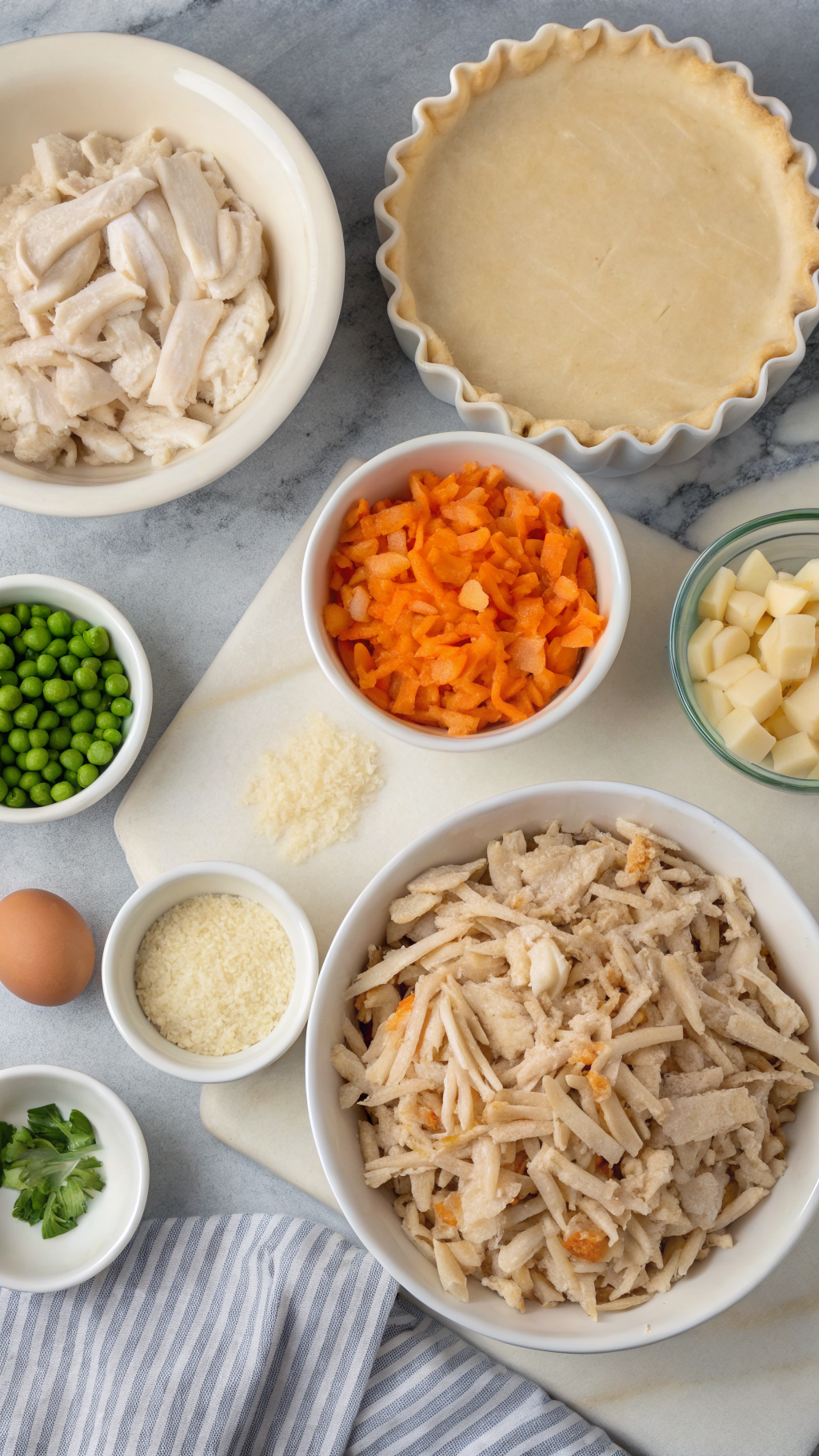 Preheat your oven to 400°F. Set the pie crusts out so they soften slightly while you cook the filling. Dice the onion, carrots, celery, and chicken so everything cooks and mixes evenly.