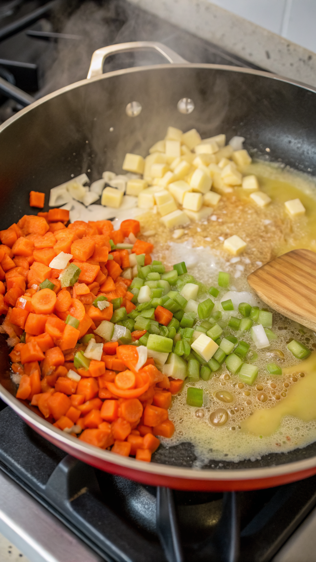 - Sprinkle the flour over the vegetables and cook, stirring constantly, for 1–2 minutes to form a roux.