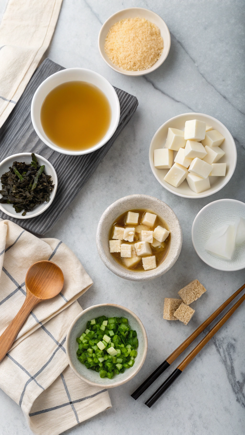 Pat the tofu dry with a clean towel and cut it into small cubes, about ½ inch. Slice the green onions, keeping the white and green parts in separate piles. Rinse the dried wakame briefly, then soak it in a small bowl of warm water for about 5 minutes until it softens.