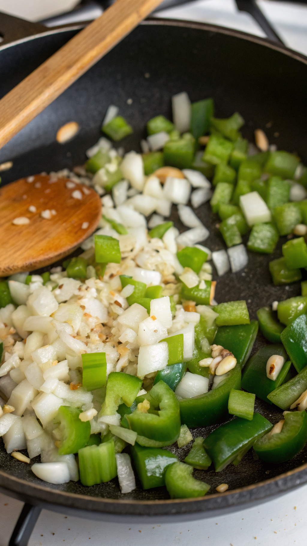 - Add the chopped onion and green bell pepper to the skillet and cook, stirring often, until softened, about 3–4 minutes. Drain excess fat if needed.