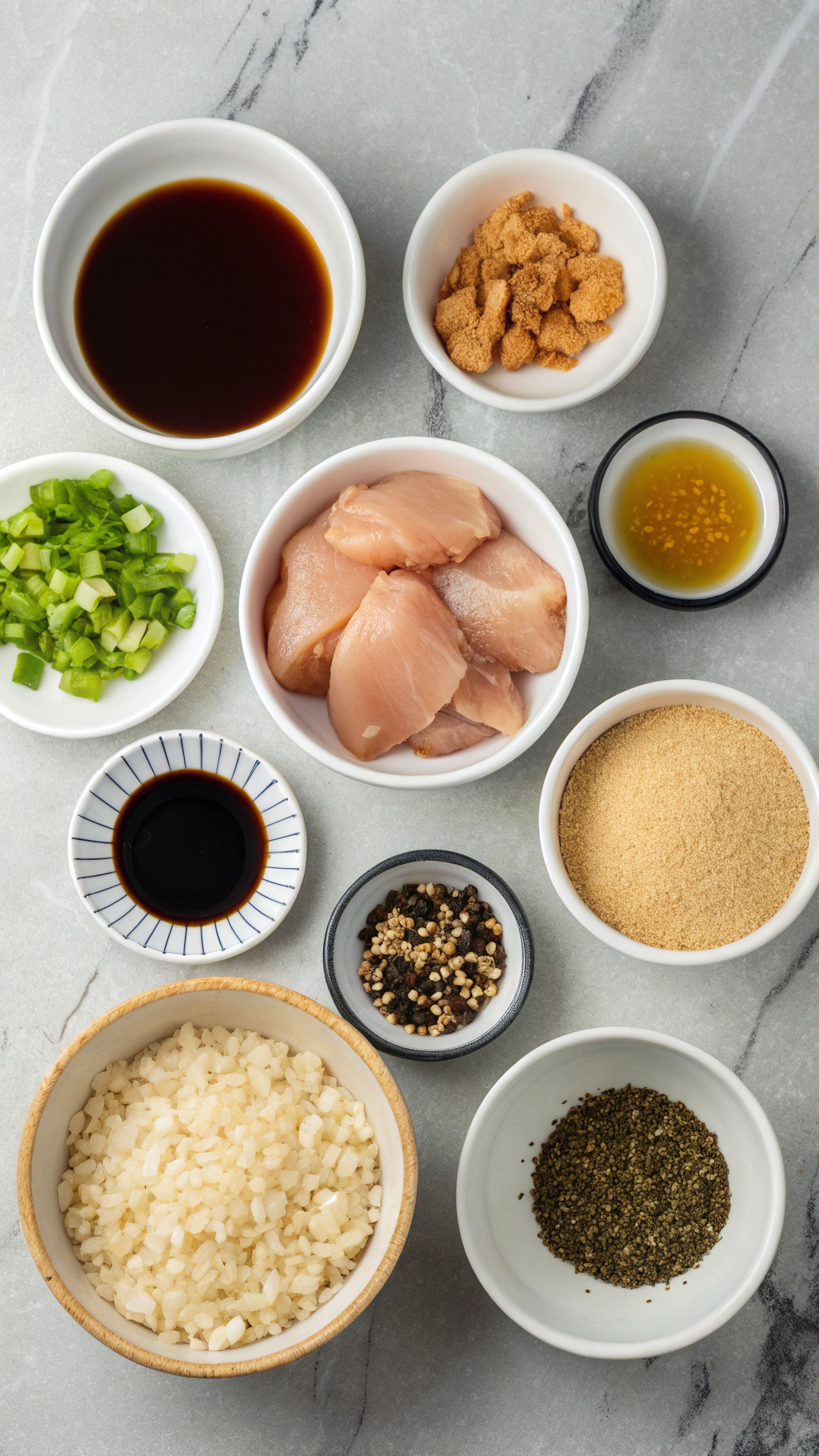 Cut the chicken thighs into bite sized pieces and pat them dry. Season lightly with black pepper and a small pinch of salt. In a small bowl, whisk together low sodium soy sauce, dark soy sauce, brown sugar, rice vinegar, and water or broth until the sugar dissolves.