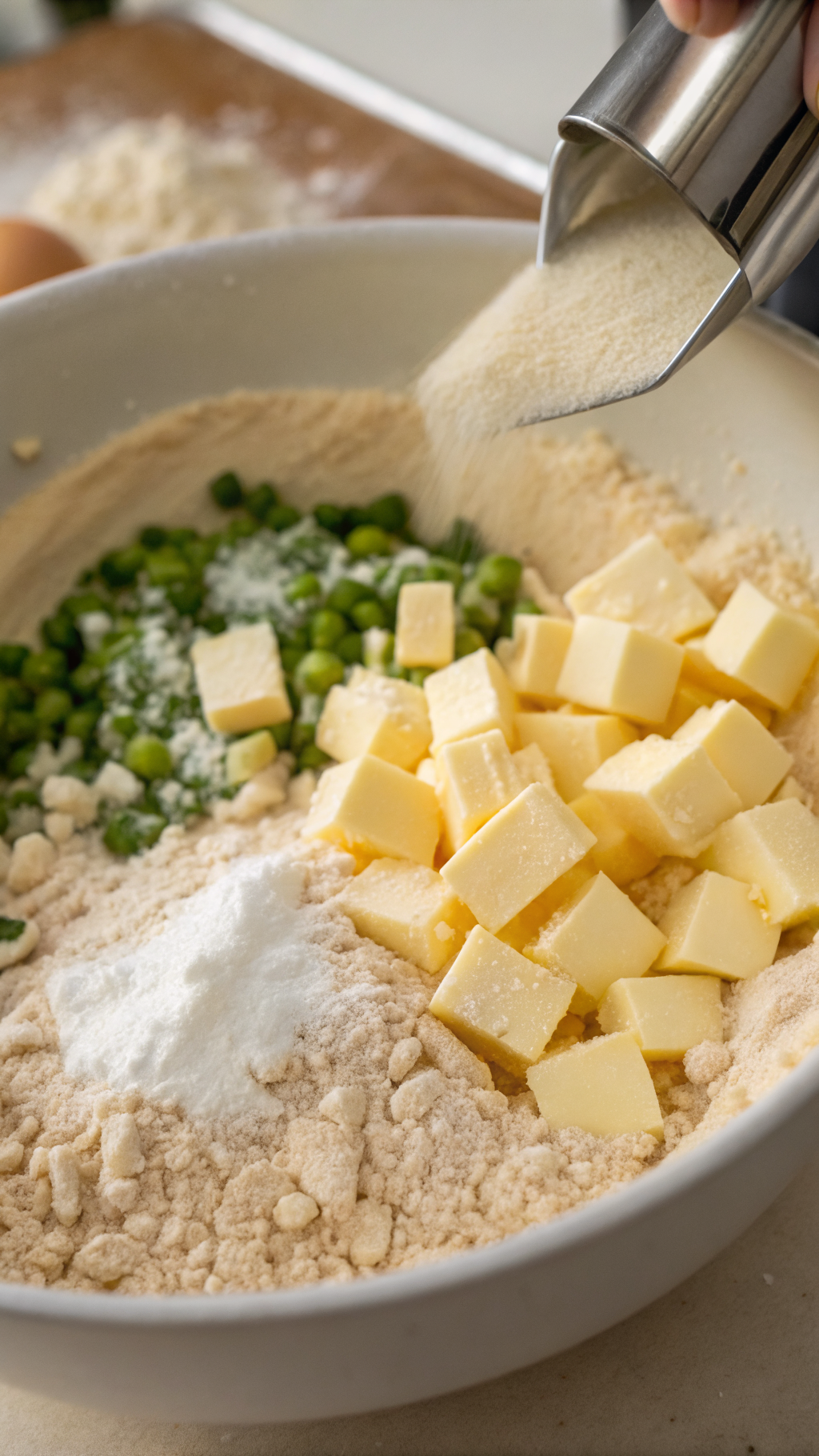 - Add the cold cubed butter and cut it into the dry ingredients with a pastry cutter or your fingertips until the mixture resembles coarse crumbs with some pea-sized pieces of butter remaining.
