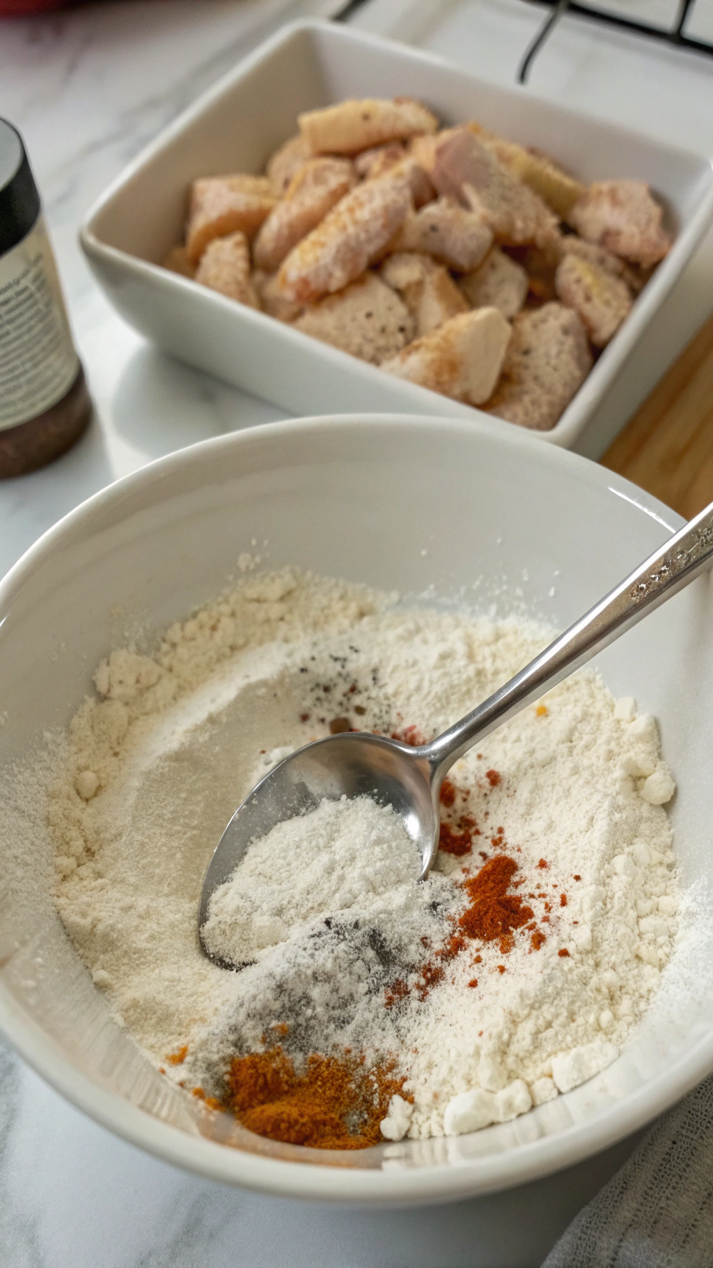 Add flour, cornstarch, salt, paprika, black pepper, cayenne, and baking powder to a shallow dish. Stir everything until the mixture looks uniform and no streaks of cornstarch remain. Keep this dish near the stove so you can move straight from marinade to breading to oil.