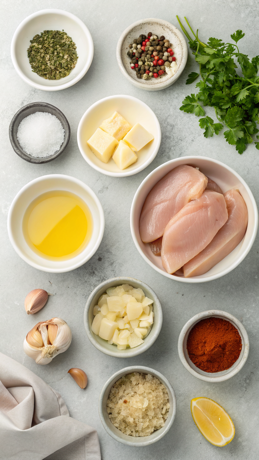 - In a small bowl, whisk together melted butter, minced garlic, olive oil, salt, black pepper, paprika, dried thyme, and dried parsley. Stir in lemon juice if using.