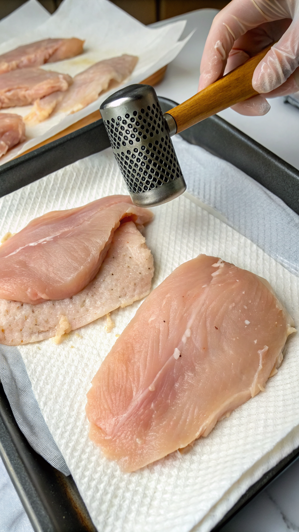 Preheat your oven to 400°F and lightly grease a 9×13 inch baking dish. Pat the chicken breasts dry with paper towels and place them on a cutting board. If one side looks much thicker, cover with plastic wrap and gently pound with a meat mallet or rolling pin until the thickness looks even.