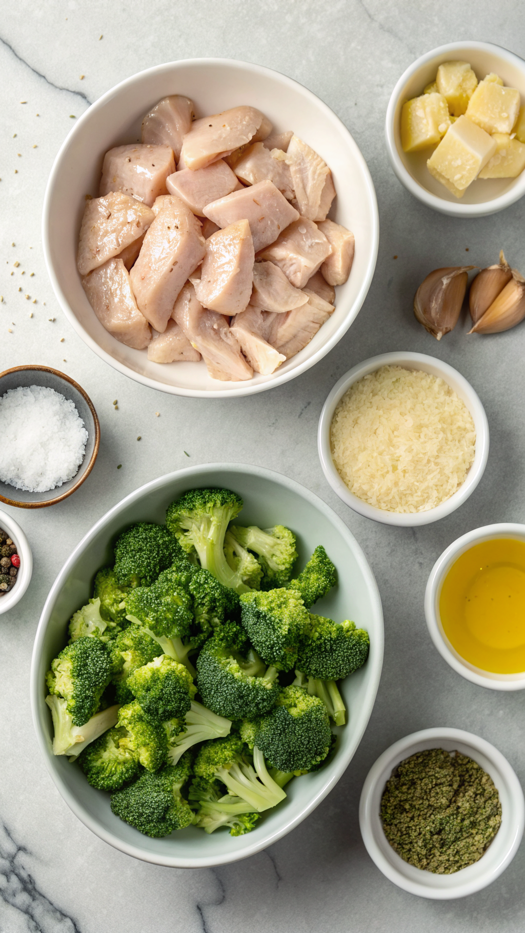 Add chicken pieces to a bowl. Toss with soy sauce, olive oil, cornstarch, salt, and pepper until every piece looks coated. Let the chicken sit while you prep the broccoli and garlic, about 10 to 15 minutes.