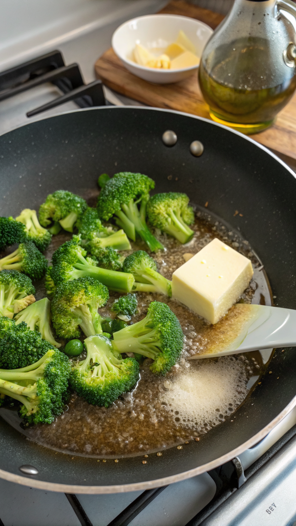 - Add the broccoli florets and chicken broth to the skillet. Stir to coat the broccoli in the garlic butter, then cover and cook until the broccoli is crisp-tender, 3–4 minutes.