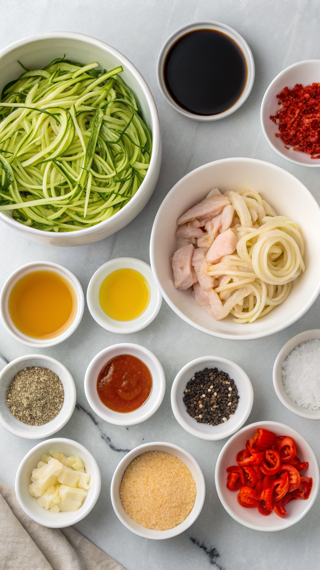 Slice the chicken, spiralize the zucchini, and cut all veggies so they sit ready near the stove. Whisk the soy sauce, broth, rice vinegar, honey, oyster sauce, sesame oil, and cornstarch in a small bowl until smooth. This quick prep keeps the Garlic Chicken Zucchini Noodles Stir Fry Recipe moving fast once the pan heats up.