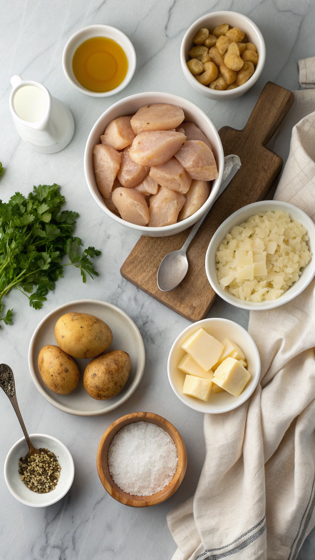 - Add the chicken pieces and halved baby potatoes to the bowl. Toss until the chicken and potatoes are evenly coated with the garlic-Parmesan mixture.