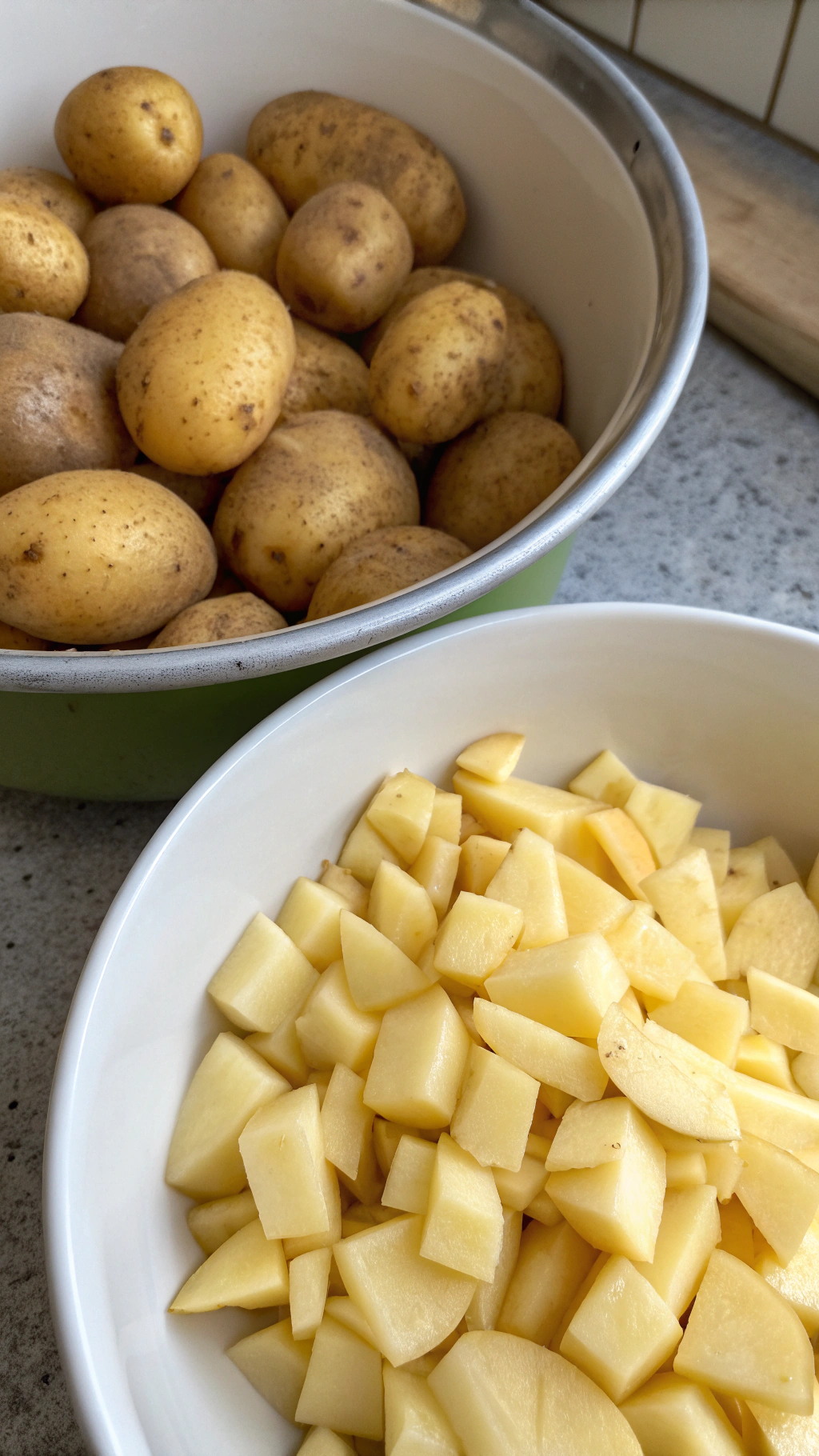 Preheat your oven to 400°F and line a large rimmed sheet pan with foil or parchment for easier cleanup. Pat the chicken thighs dry with paper towels and trim any extra loose skin or large pockets of fat. Rinse the baby potatoes, dry them well, and cut them into even pieces so they roast at the same rate.