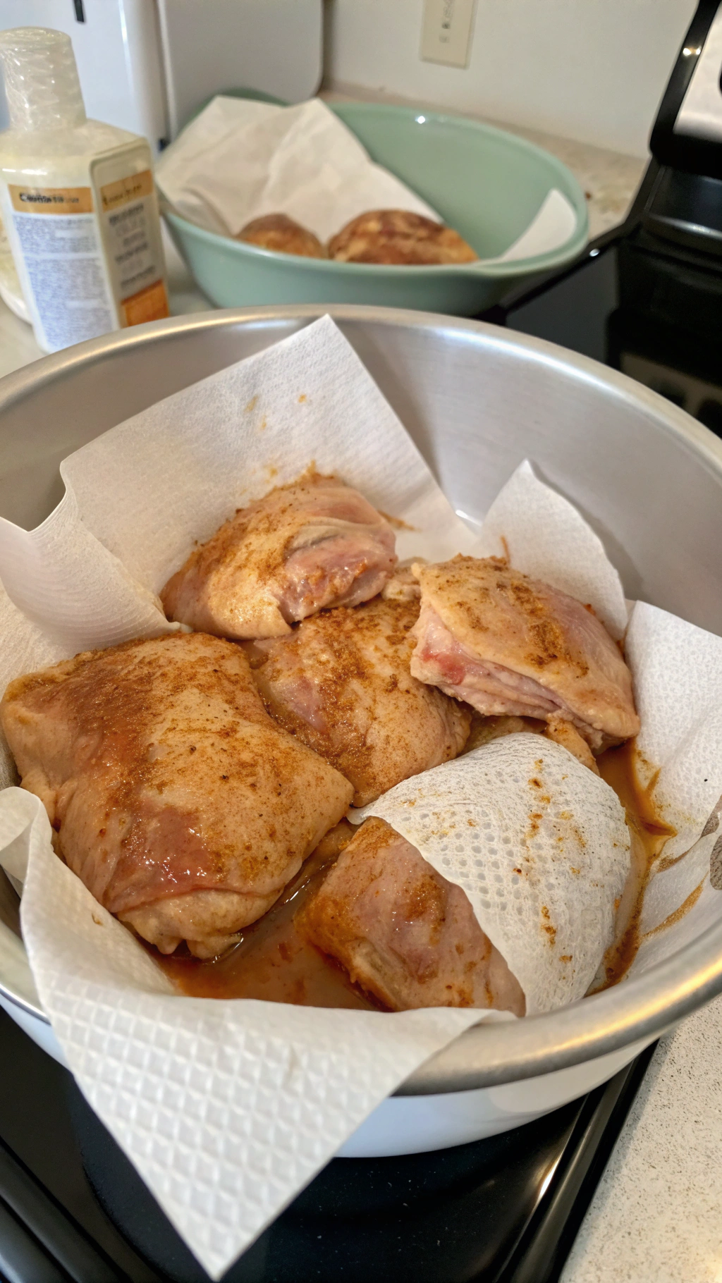 - Pat chicken thighs dry so the skin crisps instead of steaming.