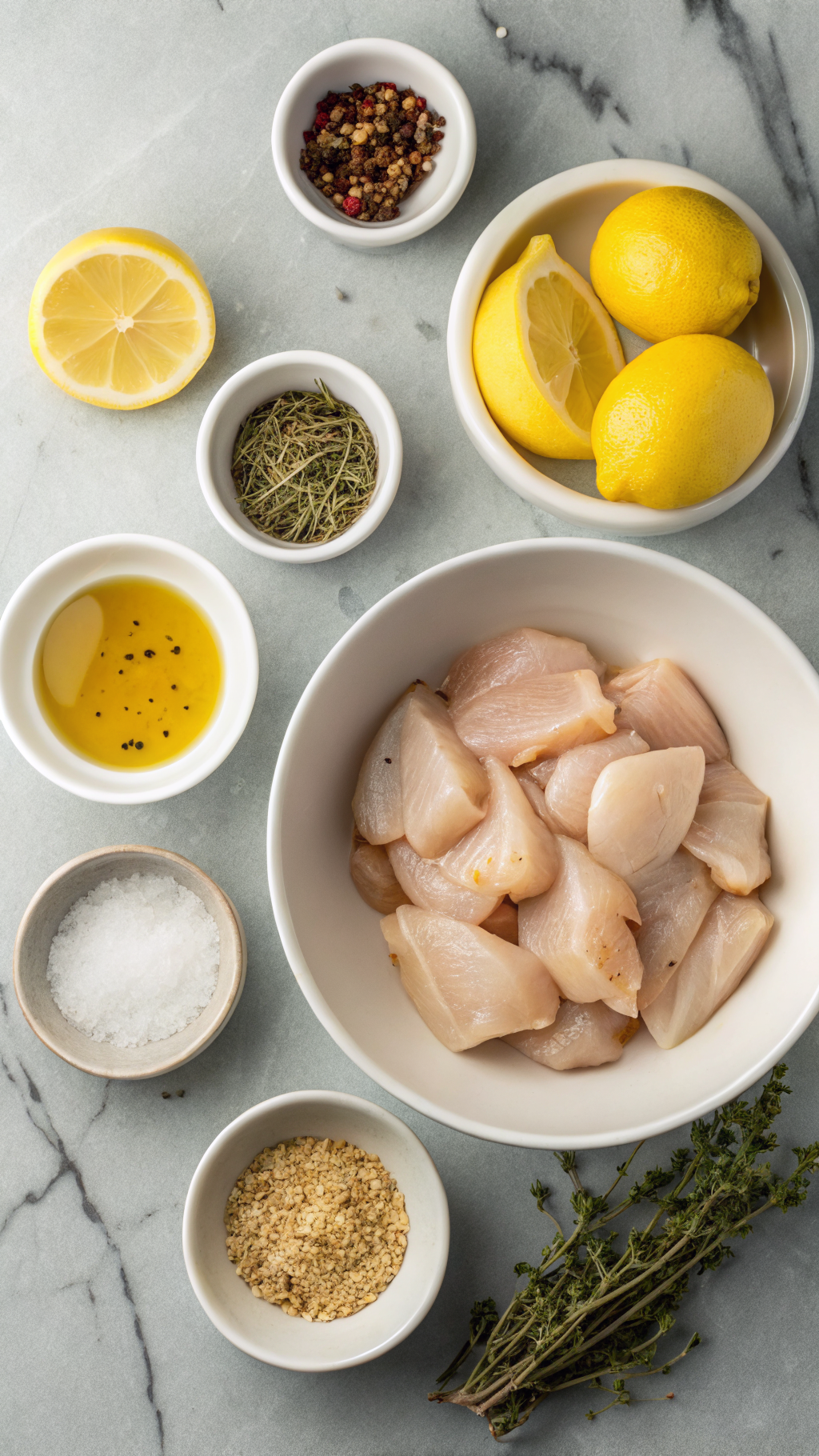 1. In a large bowl, whisk together olive oil, lemon juice, lemon zest, minced garlic, oregano, thyme, rosemary, salt, and pepper.