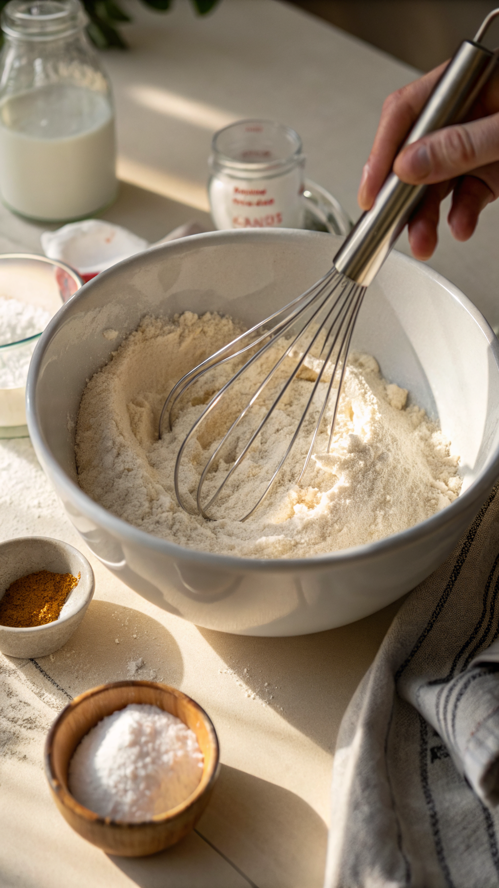 • Whisk dry ingredients together first so the baking powder and baking soda spread evenly.